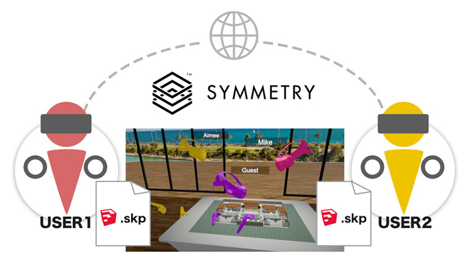 バージョン1.3で実装された「オンラインコラボレーション機能」では、インターネットに接続されている遠隔地のそれぞれの「SYMMETRY alpha」で、同一の「SketchUp」ファイルをVR空間に読み込んで表示。同一のVR空間にアクセスできる。音声チャットなどによるコミュニケーションにも対応している。