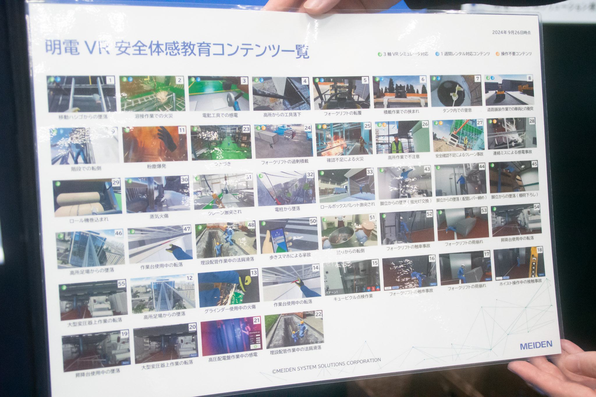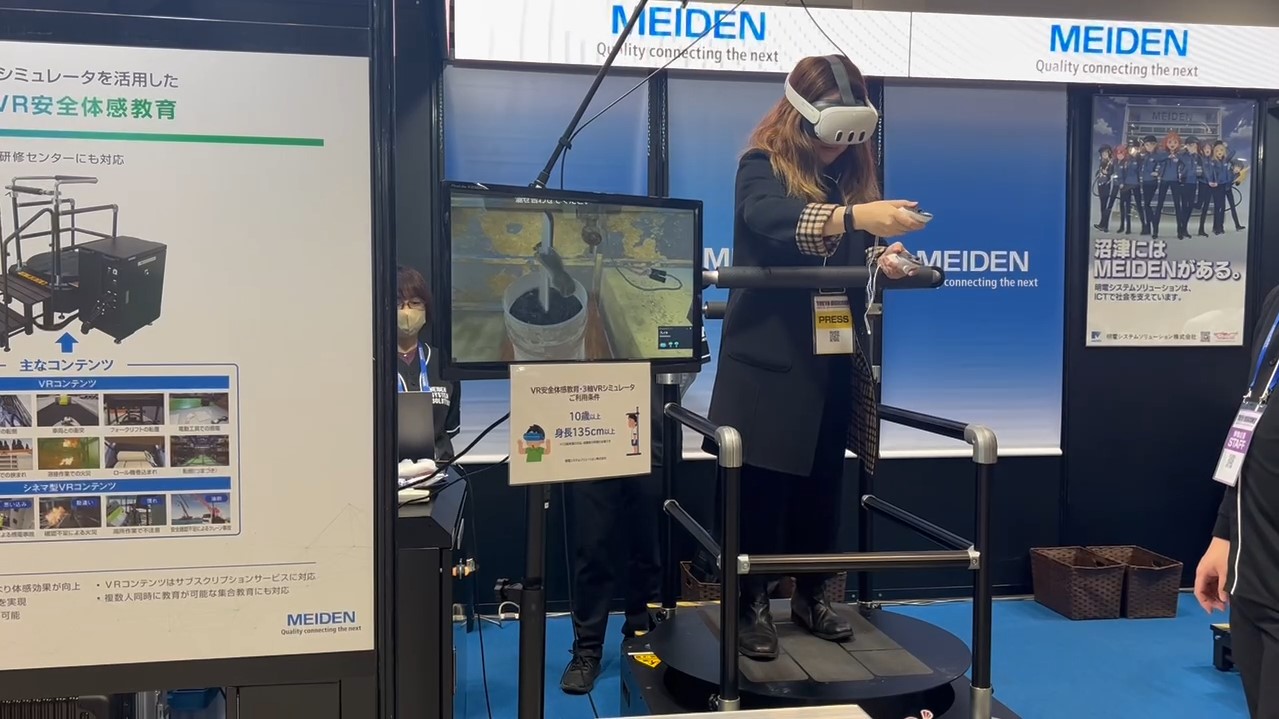 例えば、VRで労働災害を疑似体験できる明電システムソリューションによる「3軸VRシミュレータ」は、まさに体験することでそのよさを体感できるコンテンツだった。
