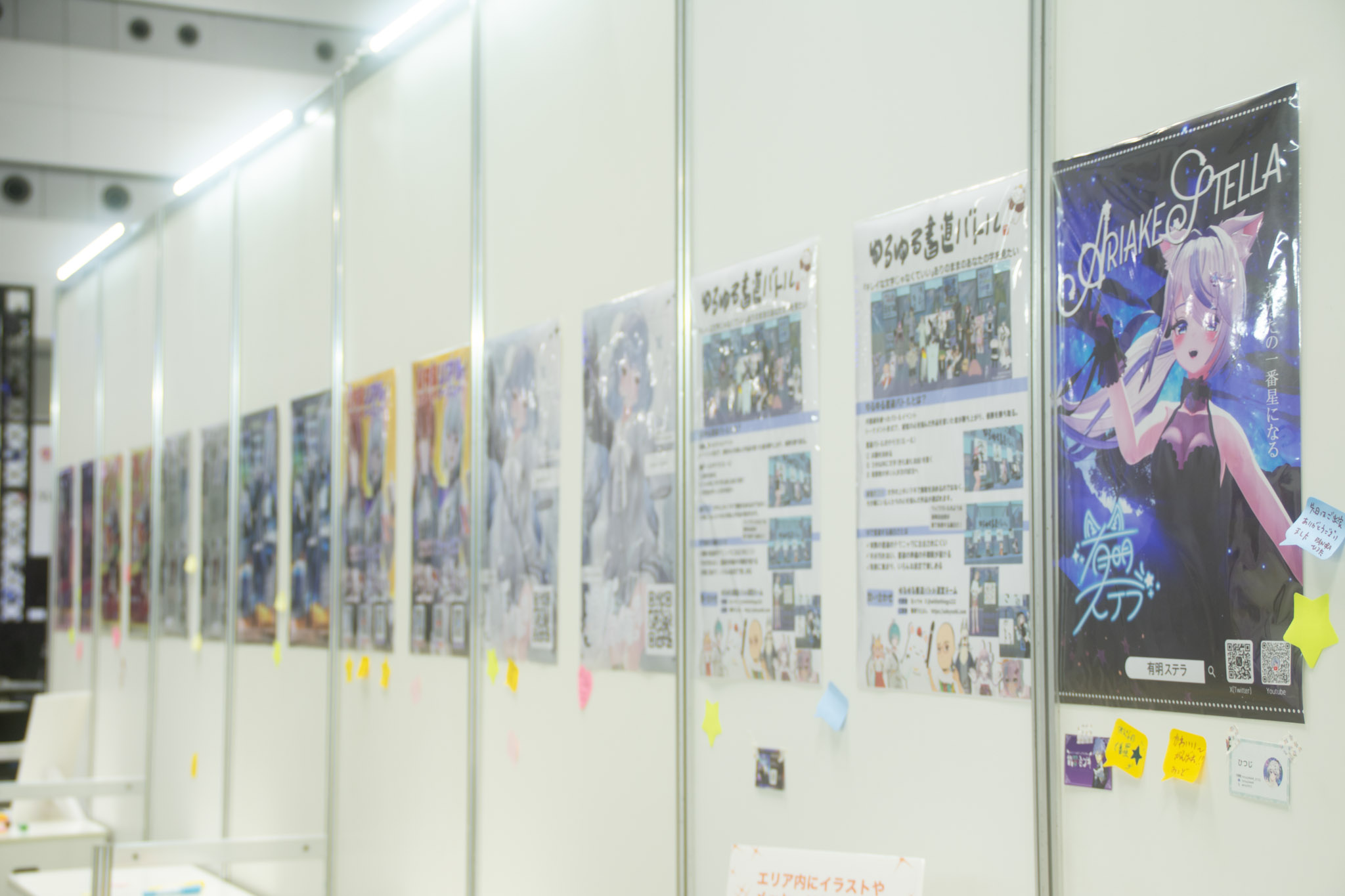 ここには、VRChatで活動する個人のクリエイターや団体のポスターが掲出されており、来場者はVRChatでメッセージを残すように、用意されているポストイットでコメントを書き残すことができたのが印象的だった。