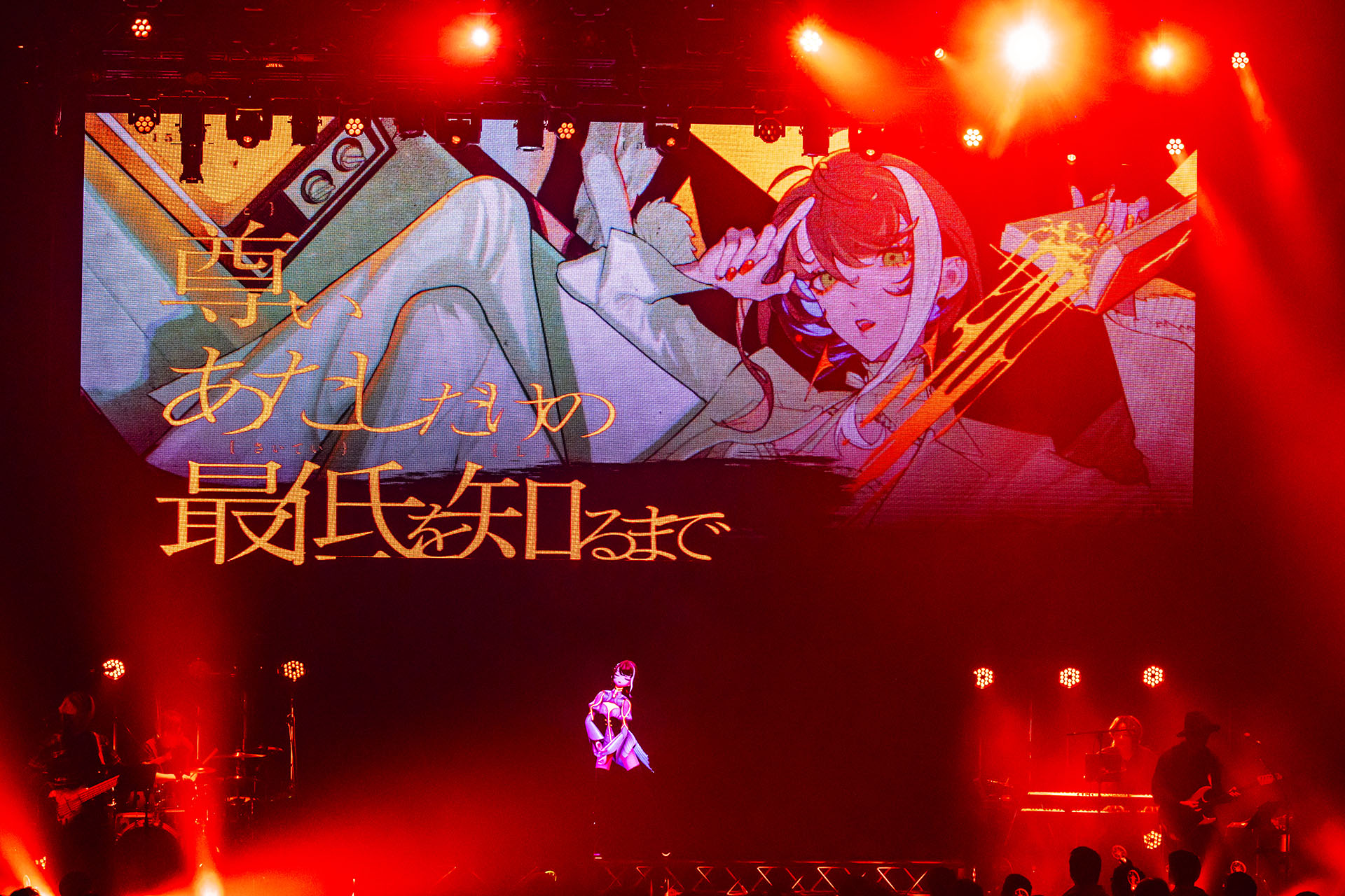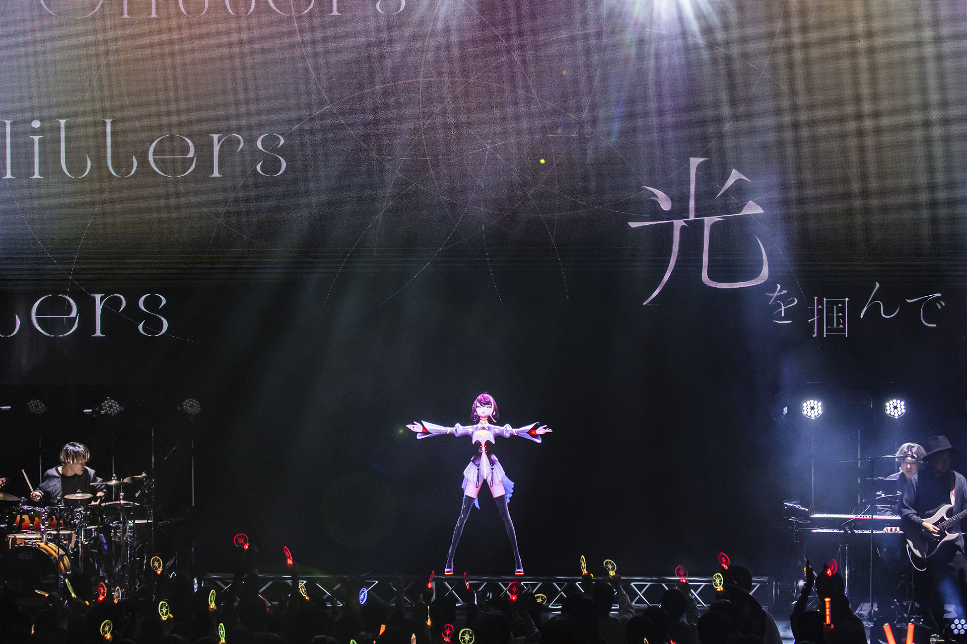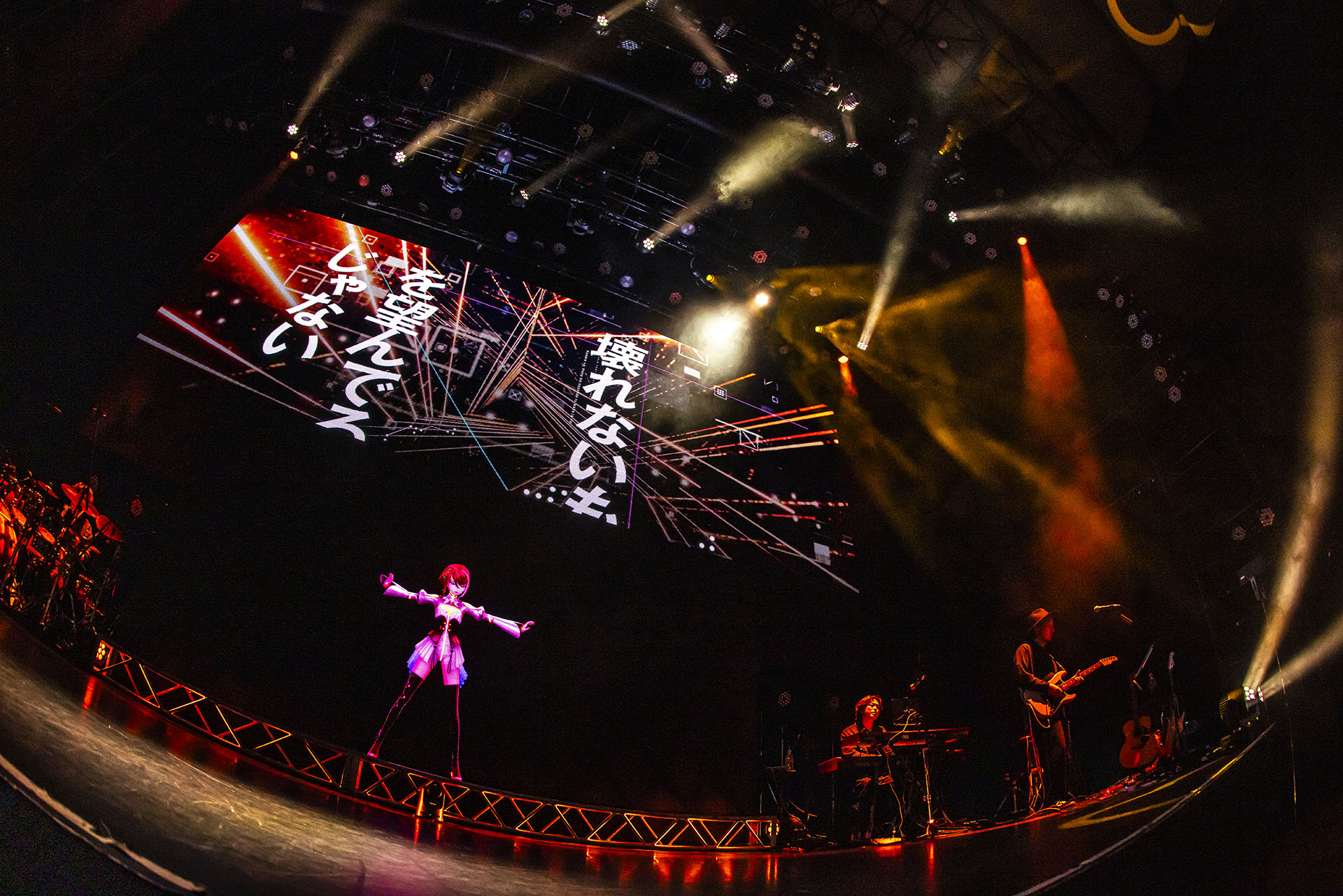 「dazzling」ではアコースティックギターと明透のボーカルが引っ張っていく展開に。ここまでライブのなかでスロー&メロウな楽曲は何曲か披露されていたが、それでもアコースティックギターの響きは新鮮に響く。ふだんのビジュアルでは凛とした顔立ちをしている明透、そんなイメージにバッチリとハマったパフォーマンスだった。