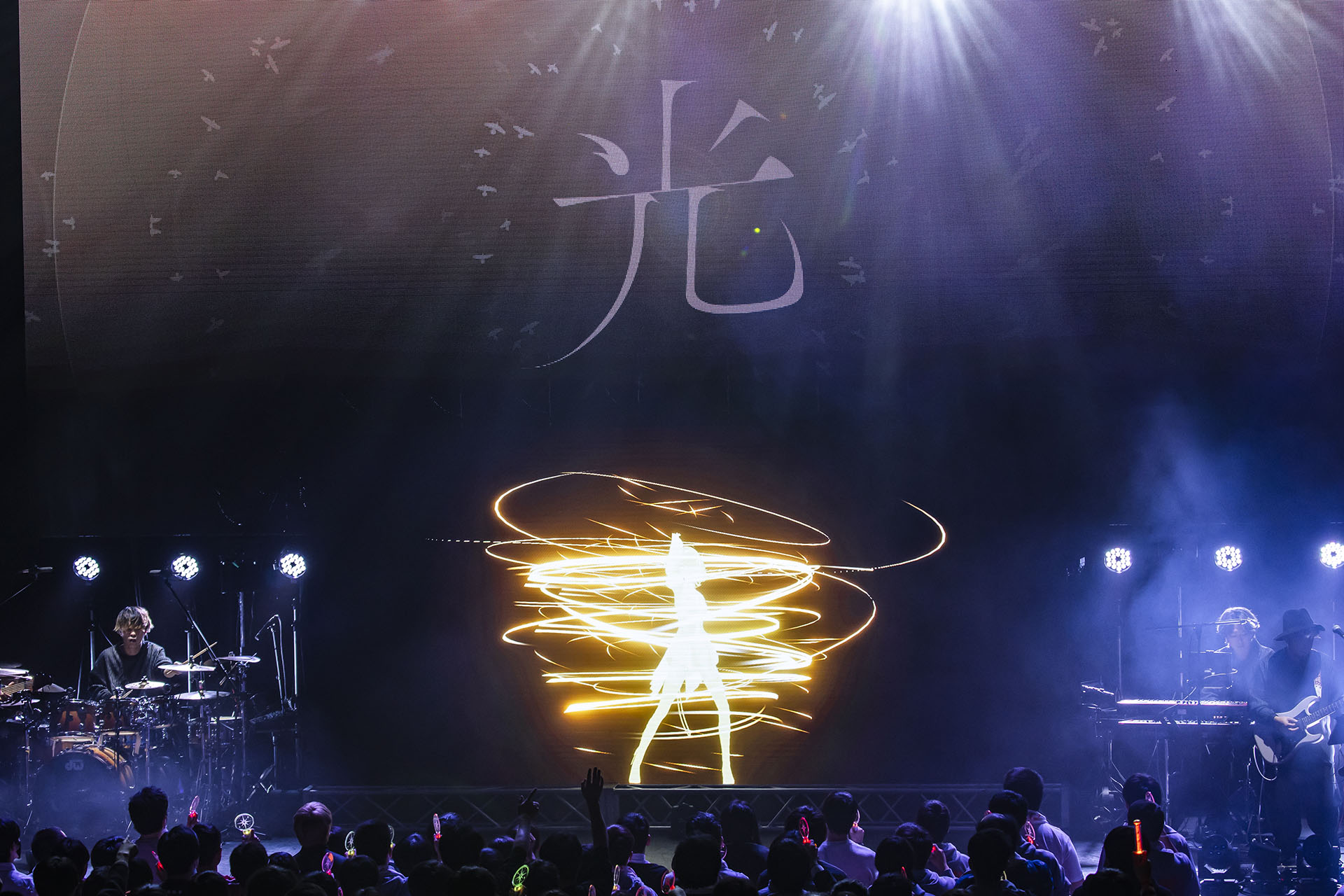 18時に開演したこの日のライブ。宇宙・銀河を思わせる星々、そのなかに浮かび上がる明透、以前までの黒を基調にした衣装から白を基調にした衣装へとスッと変化し、閉じていた目を開けて薄緑の瞳がこちらを眼差す……そんなオープニングムービーから、ライブへと導入していった。