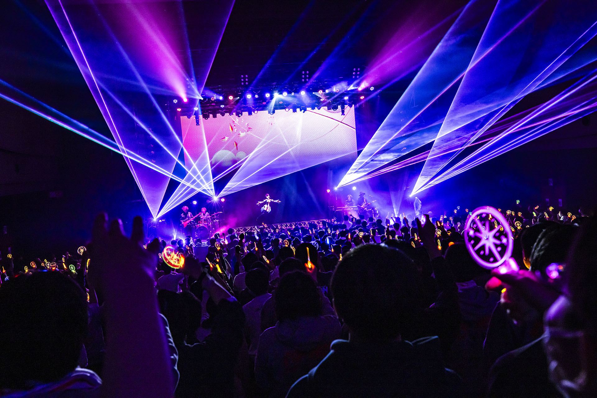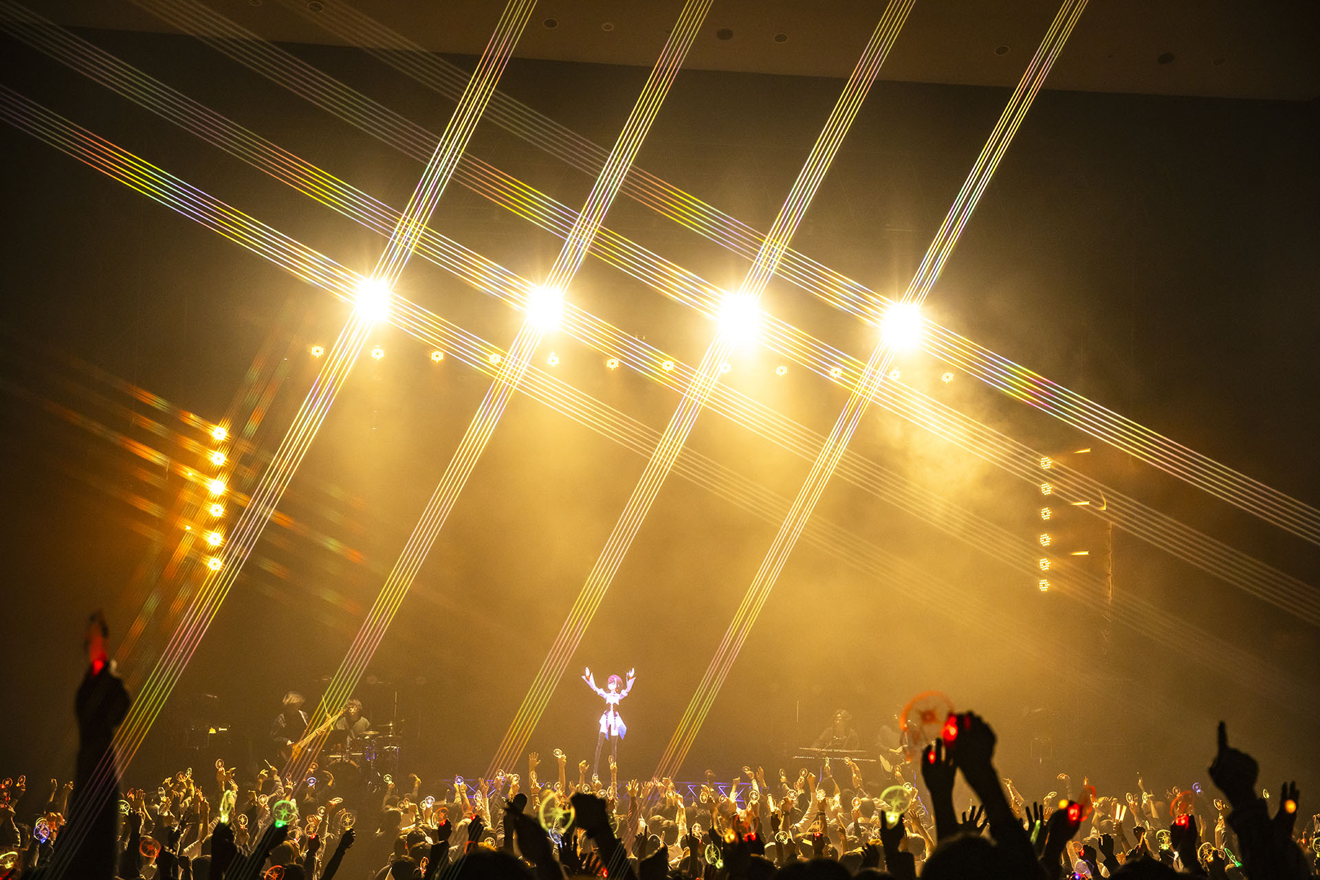 「オレンジ」では鍵盤のフレーズとエレクトロ系なエフェクトを挟みながらパワフルなバンドアンサンブルがグイグイとひっぱり、「illumia」ではファンキーなベースラインにダンサブルなビートが絡み、オレンジや黄色の照明がよりダイナミックなサウンドに色を添える。