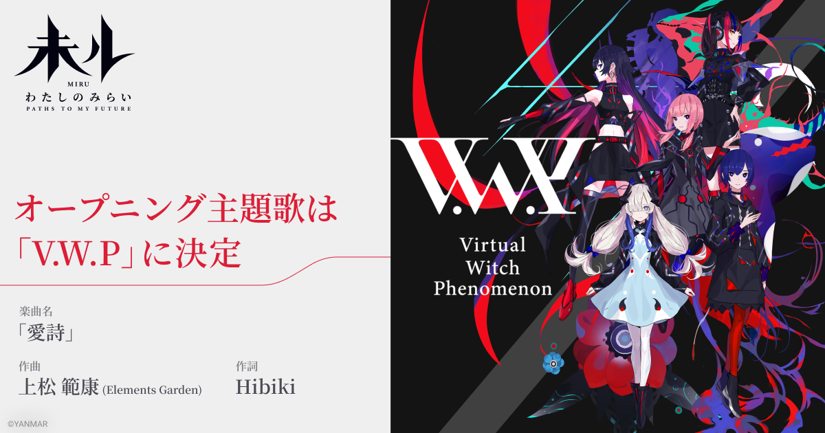 KAMITSUBAKI STUDIOは21日、PHENOMENON RECORD所属のバーチャルアーティストグループ・V.W.Pの新曲「愛詩(あいうた)」が、ヤンマーホールディングスが手がけるアニメ「未ル わたしのみらい」の主題歌に起用されることを発表。 アニメ「未ル わたしのみらい」は、植田益朗が総合プロデュースを担当している、2025年4月地上波放送予定の新作オリジナルアニメだ。「愛詩」は作曲にElements Garden代表の上松範康、作詞にHibikiを迎えた作品だ。