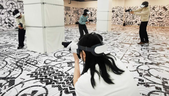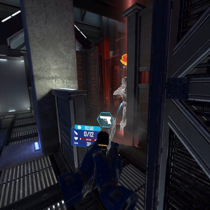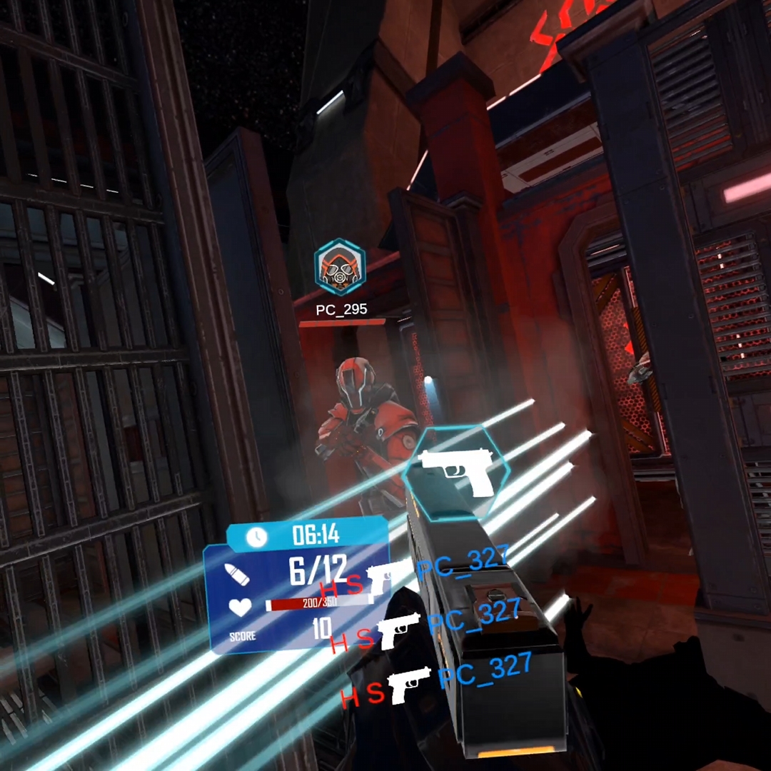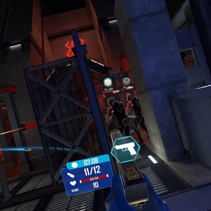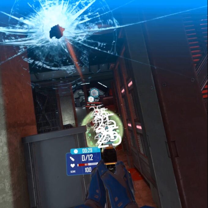 プレーに熱中するあまり、何度か「身体(or銃)がVR空間の壁に埋まっています。立ち位置を確認してください」というアラートが表示。壁を無視して移動するチート行為を防ぐため、壁に埋まるとHPが少量ずつ減っていく仕様にもなっているそうだ。