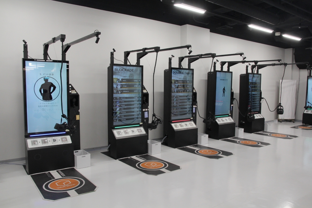 スタッフからの説明を受けている時、すでに別メディアの記者が2人、フィールドでプレーしていたのだが、フィールドの入口に設置されたモニターでは、5対5で戦闘中。プレーヤーが足りないときは、CPUが加わって5対5となるように設定されており、参加プレーヤーが11人以上になると6対6となり、最大で8対8の試合ができるのだ。1ラウンドは3分で、販売されているチケットは10分券なので、3ラウンド遊ぶことができる。