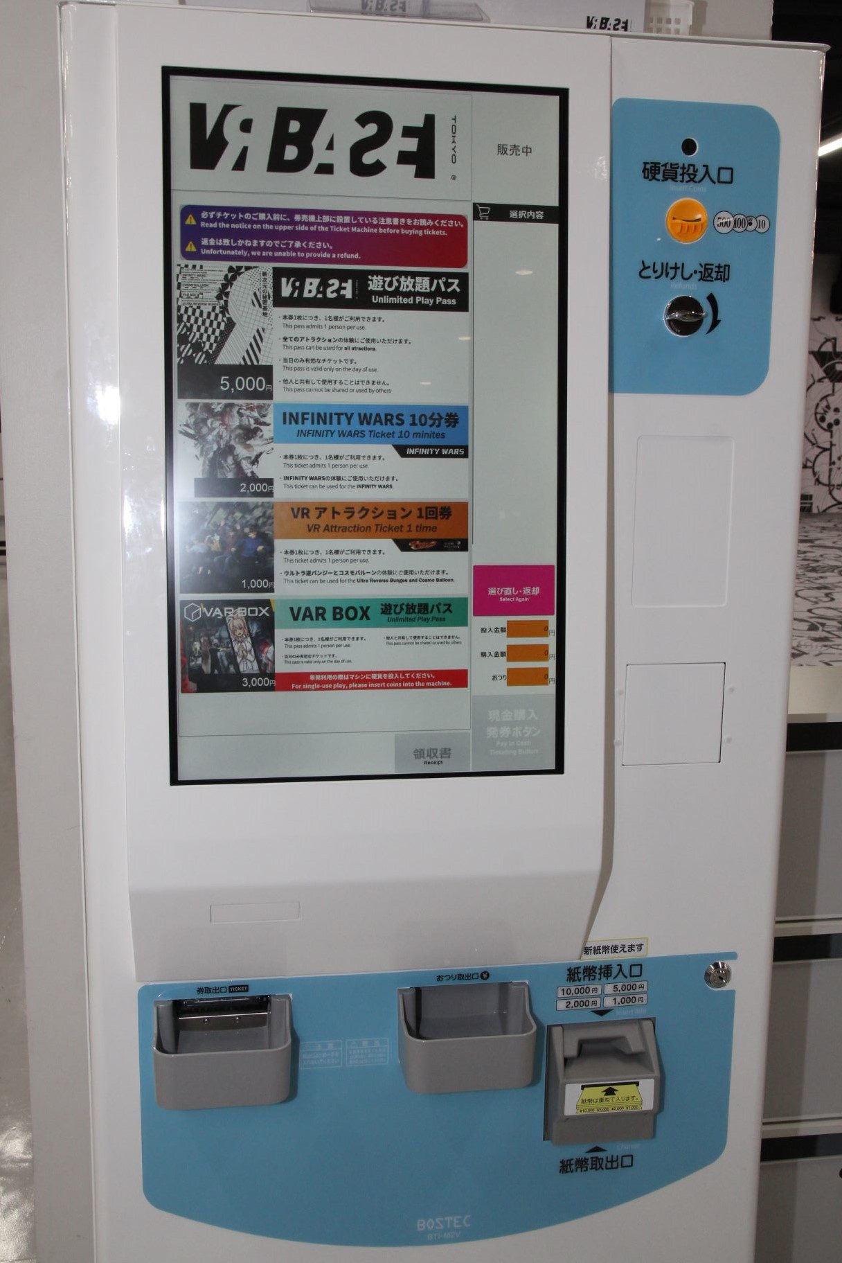 「VR BASE TOKYO」に入るとすぐに設置されているのが、各コンテンツの体験に必要なチケットを購入する券売機。「INFINITY WARS」の 10分券が2000円で、「VAR BOX」の遊び放題パスが3000円。「ウルトラ逆バンジー」と「コスモバルーン」の体験に必要な「VRアトラクション1回券」は1000円となっている。「VR BASE TOKYO」の全コンテンツが1日遊び放題になる5000円の「遊び放題パス」は人数限定で、販売されていない場合もあるそうだ。