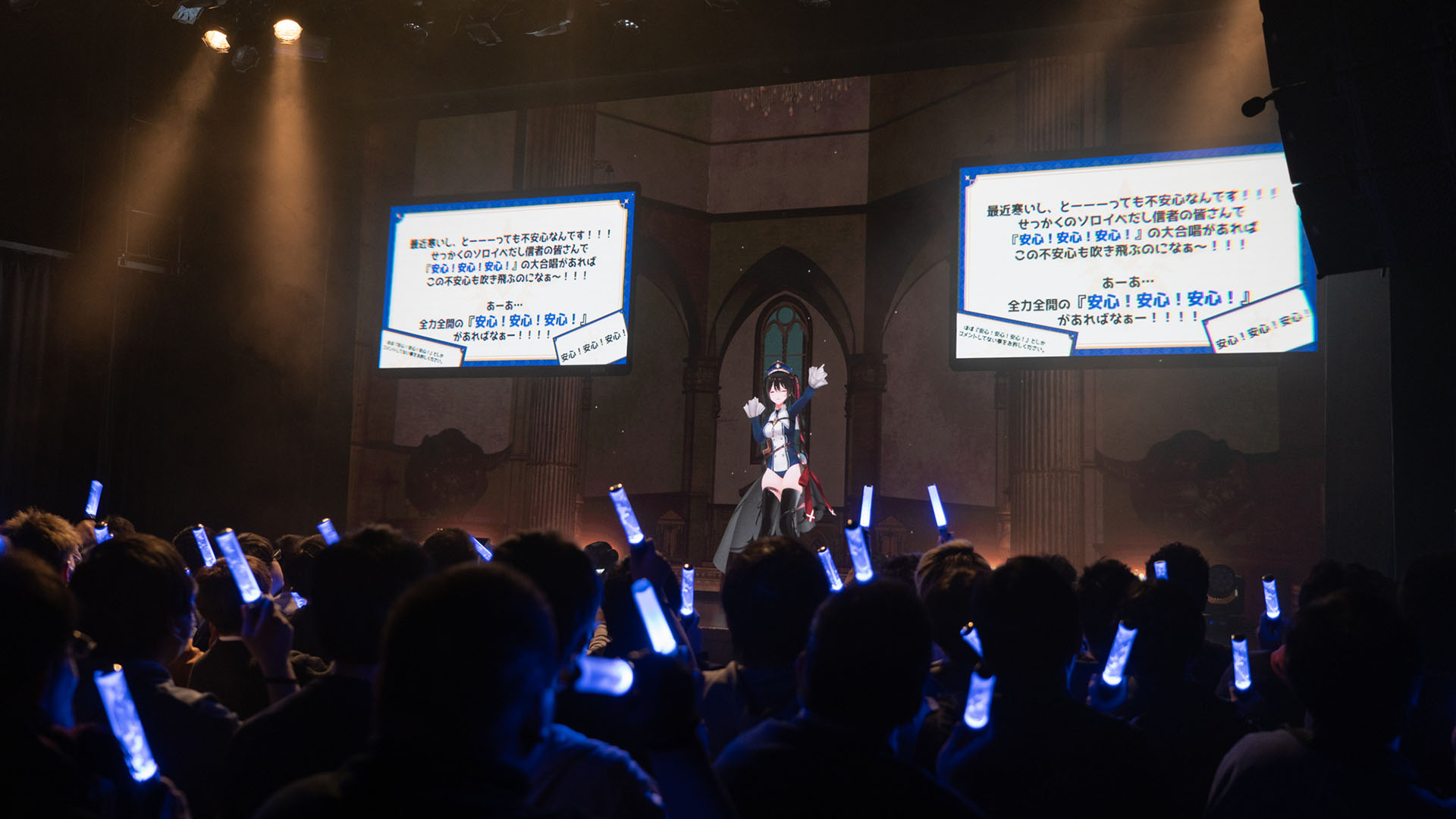 コンセプトは、彼女が掲げる「安心教」。ファンメイド曲や初のオリジナル曲「安心の讃歌」を含む歌あり、同じVEEの天籠(あまこも)りのんと「すぺしゃりて」の領国(りょうごく)つかさを迎えてのトークあり、「安心教」に入って起きたいいことを挙手して語ってもらう客席との交流あり、彼女にMRで会える3Dのミーグリあり……。「安心! 安心! 安心!」コールが絶えない盛りだくさんな空間だった。