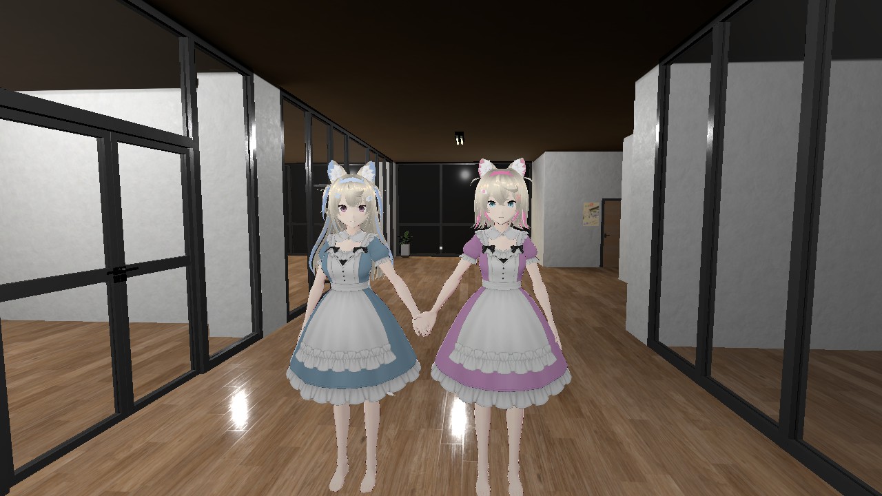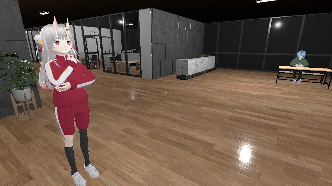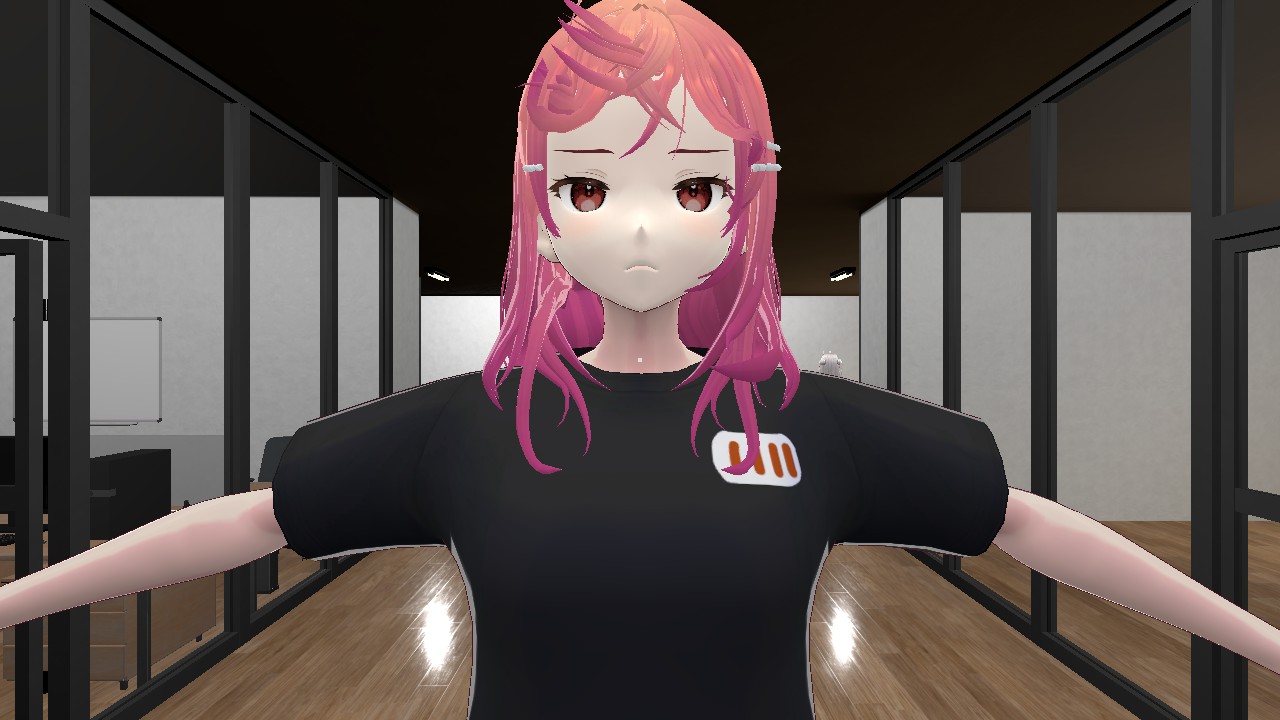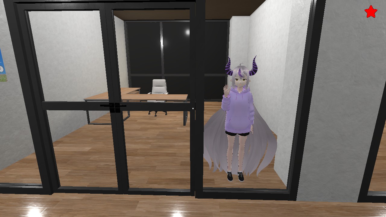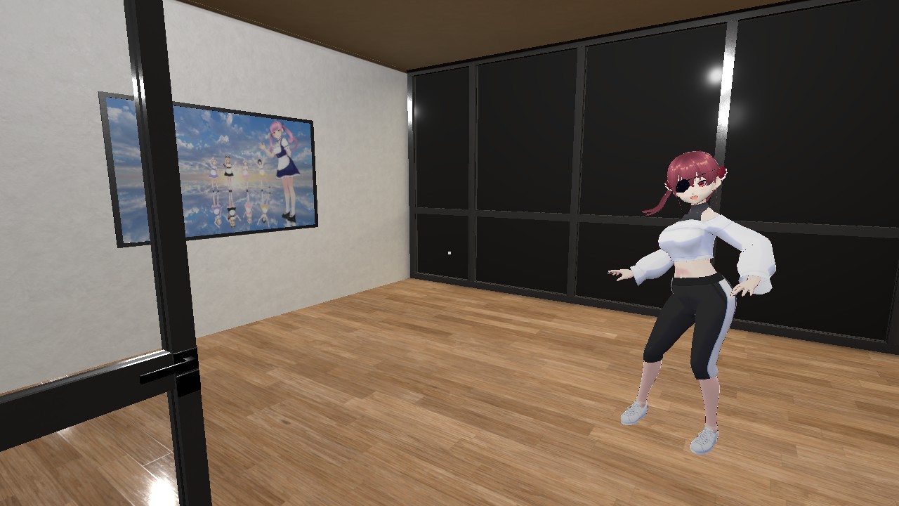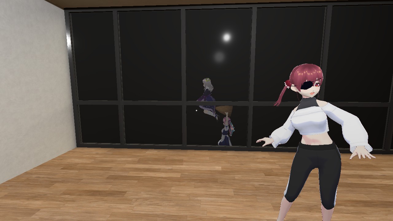 フロアには、ホロライブ0期生の星街すいせいさん、2期生の百鬼あやめさん、3期生の宝鐘マリンさんもいるが、3人は無反応。星街さんは、エレベーター前の椅子に座って、推しとの2ショットが映ったスマホを眺め、百鬼さんはエレベーターの前で何かを考えているようなポーズで棒立ち。宝鐘さんは、フロア奥の部屋であやしいおどりを続けている。