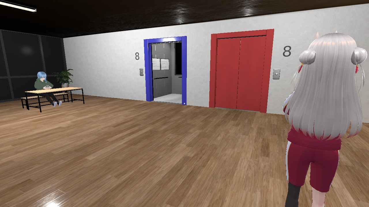 ホロライブ仮事務所の8階からゲームはスタート。仮事務所には2基のエレベーターがあり、最初は、どちらのエレベーターも扉が黒色になっている。黒いエレベーターが現れている時の事務所には、異変が発生しないノーマルな状態。まずは、フロアを歩き回って、正常な状態をよく覚えておく必要がある。