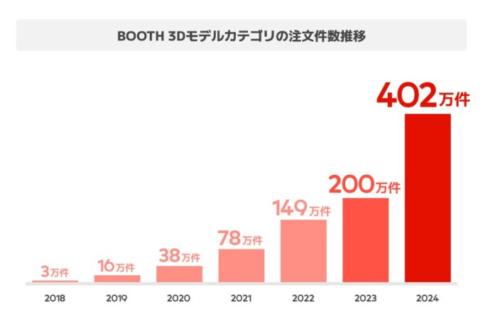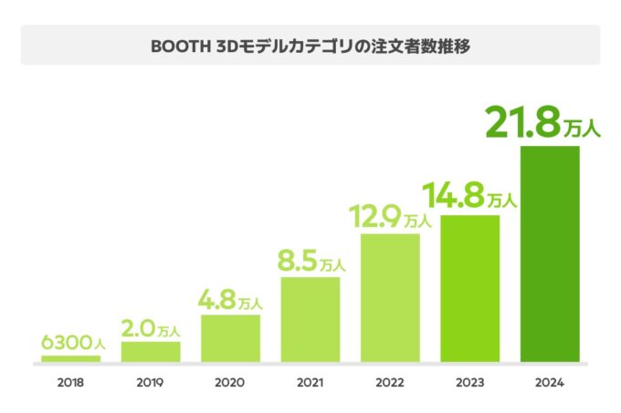 ピクシブが運営する創作物の総合マーケットプレイス BOOTHが、自社のオウンドメディア・pixiv insideにて「BOOTH 3Dモデルカテゴリ取引白書2025」として記事を公開し、そのなかで2024年のBOOTH 3Dモデルカテゴリ取扱高・注文件数が前年と比較して約2倍、注文者数も前年比から約1.5倍にも増加したと明らかにした。