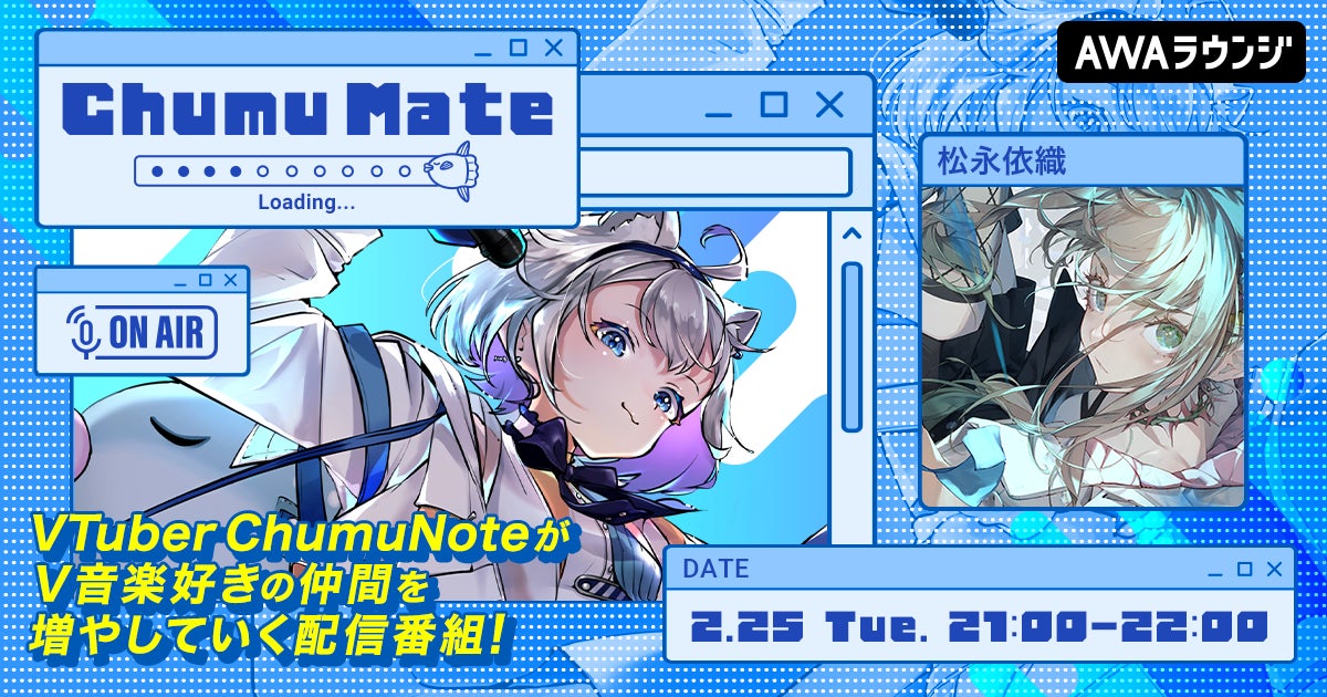 AWA株式会社(本社:東京都港区、代表取締役CEO:冨樫晃己)が運営する、サブスクリプション型(定額制)音楽ストリーミングサービス「AWA(アワ)」は、2025年2月25日21:00~22:00の1時間に渡り、無料で誰でも参加できるオンライン空間「ラウンジ」で、VTuberのChumuNoteがゲストアーティストと共に楽曲を深掘りし、V音楽好きの仲間を増やしていく音楽番組『ChumuMate』の第6回を開催いたします。