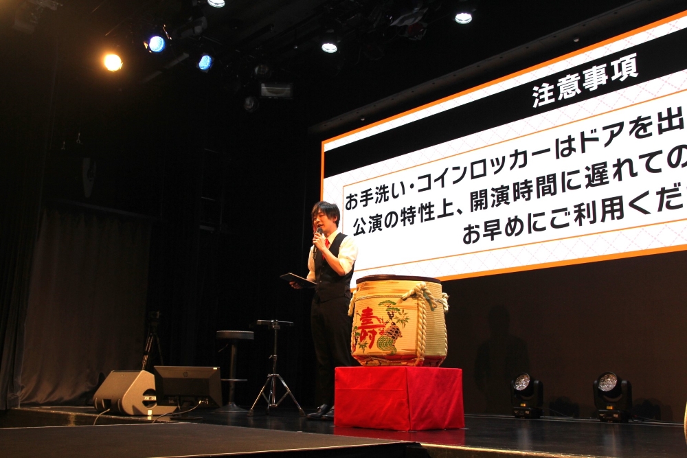 2人は、鏡開きのための木槌を一本ずつ手に取り、「なかなかライブハウスで木槌を持つ人いないですよね」「あんまりないかもしれない」などと話しながら酒樽の近くに移動。鏡開きらしく「せーの、よいしょ」という掛け声に合わせて酒樽の蓋を割ろうという話になりました。繚乱さんは、メディア関係者が座る客席に向かって、「皆さんも『よいしょ』の声出しをお願いしていいですか? 『声出しさせられた』とか(記事に)書いていただいて構わないので(笑)」と声をかけます。加賀美さんの「では、お声を拝借いたします。せーの!」という声に合わせて、客席の我々も一緒に「よいしょ!」。加賀美さんはステージに向かって右側から、繚乱さんは左側から同時に木槌を振り下ろし、縁起物の行事である鏡開きを成功させました。