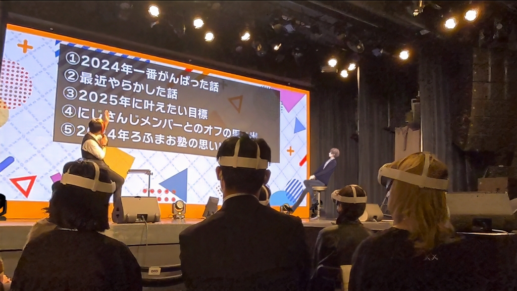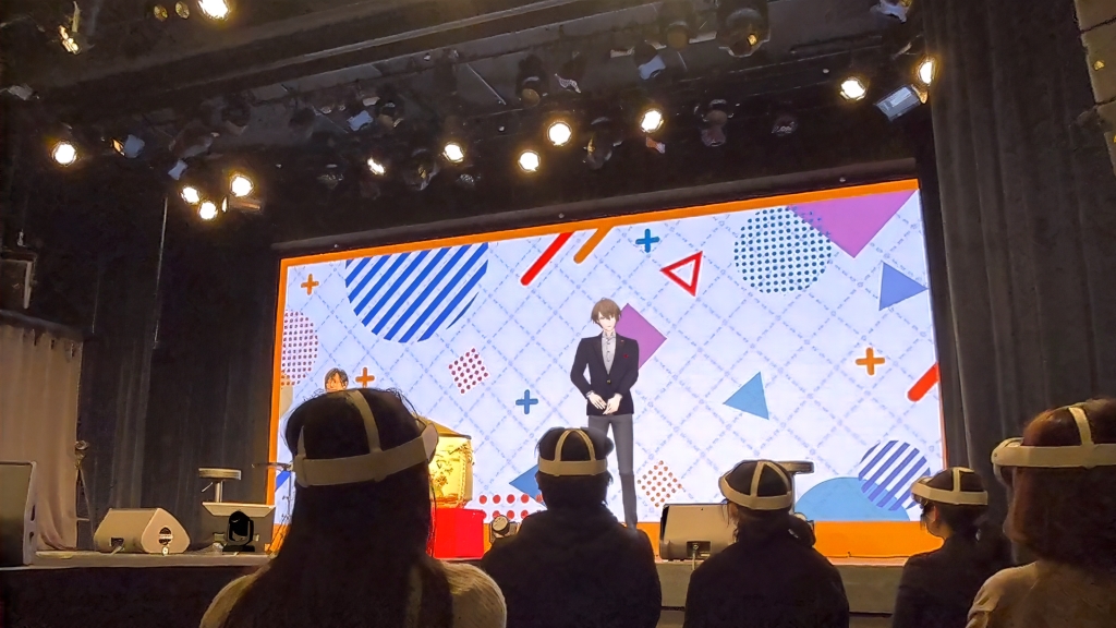 ステージに、にじさんじ主催ライブの事前放送などでもお馴染みMCの百花 繚乱さんが登場。繚乱さんの案内やステージ奥のスクリーンに上映される動画に従って、椅子の下に一つずつ置かれていたヘッドマウントディスプレイ(Meta Quest3)を装着。コントーラーは用意されておらず、参加者が何かの操作をすることはないようです。装着の際には、左右の客席エリアに2人ずつ程度のスタッフが付きサポートをしてくれました。今回の参加者は、さすがメディアの人間ばかりということで、ヘッドマウントディスプレイの装着もスムーズ。ニット帽とメガネの上から装着した筆者が一番手間取っていたかもしれません。
