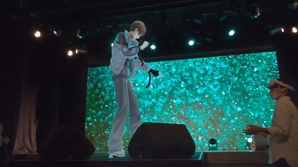 そして、イベント(のゲネプロ)が始まり、繚乱さんの呼びかけに応えて、加賀美さんがステージに登場。新年になったばかりということで、「お正月」をお題にしたトークが始まります。ステージに現れたところから自然だったので、驚くタイミングを逃して普通に観ていたのですが、いつもモニターの中で観ている「バーチャルライバー加賀美ハヤト」が、さっきまで肉眼で観ていたステージに立っていました。