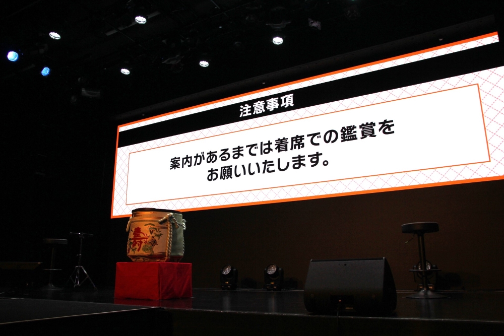 2日間で全5公演が開催され、チケット抽選に当選した幸運なにじさんじファンが参加できた「実証実験イベント」。我々、メディア関係者が取材したのは、本番前に同じ会場、同じ条件で行われたゲネプロでした。本番同様、並んで会場に入場し、並べられた椅子に着席。客席は、ステージ中央から伸びる花道を挟んで左右に10席ずつ。1回の公演に参加できるのは20人だけという激レアなイベントです。ステージの中央には大きく「寿」と書かれた鏡開き用の酒樽があり、それを挟んで二つの丸椅子が置かれています。
