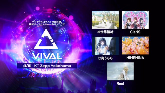 VIVALのタイムテーブルは下記画像の通り。18時から七海うらら、 18時30分からClariS、19時からヰ世界情緒、19時30分からReol、そして20時にHIMEHINAがトリを務める。