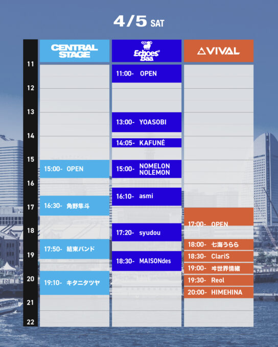 ソニー・ミュージックは7日、都市型フェス「CENTRAL MUSIC & ENTERTAINMENT FESTIVAL 2025」各会場のタイムテーブルを公開。CENTRALは、Kアリーナ横浜、横浜赤レンガ倉庫 赤レンガパーク特設会場、KT Zepp Yokohama、臨港パークの横浜の4会場で開催。KT Zepp Yokohamaで4月5日に開催される「VIVAL」ではヰ世界情緒、ClariS、七海うらら、HIMEHINA、Reolが出演する。