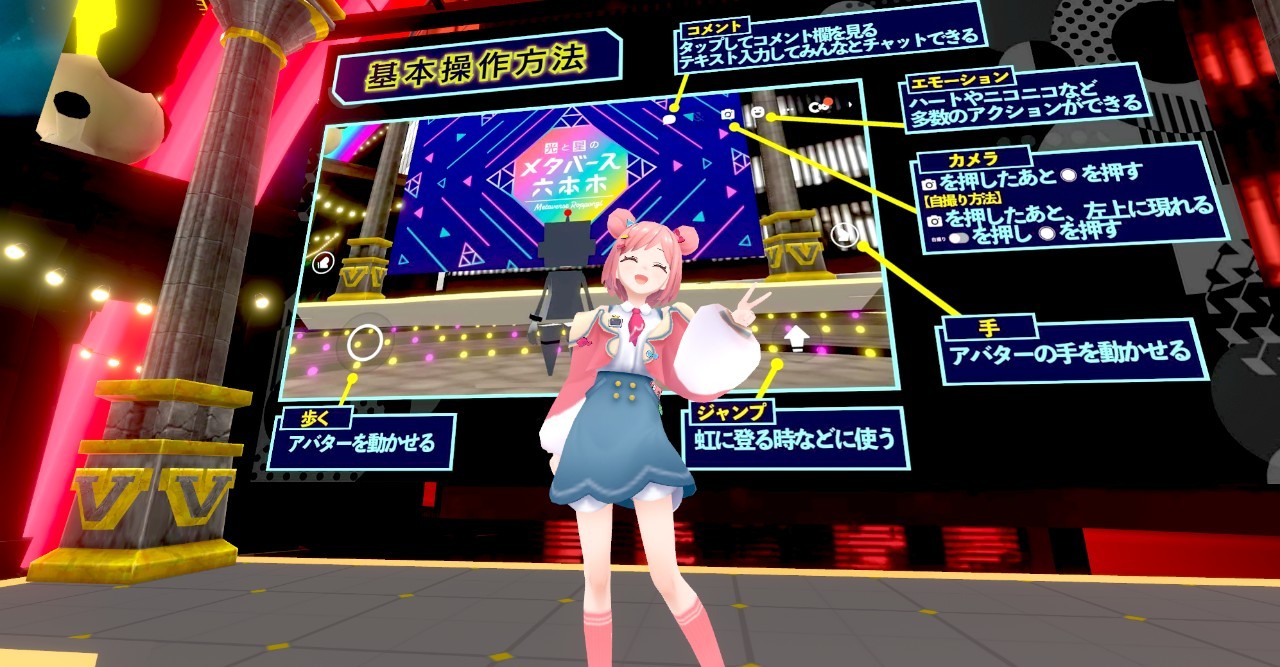 cluster 初心者のユーザーにも楽しんでいただけるように桜葉ハグによる操作説明やメタバースを楽しむコツが紹介されました。大西アナウンサーもメタバースデビューということで、参加者のみなさんと一緒に操作方法を教わりながら進行していきます。