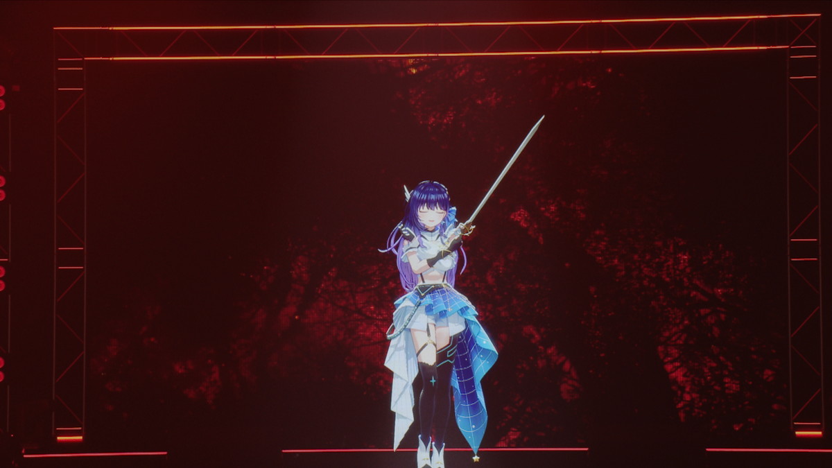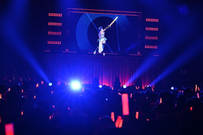 一瞬の暗転の後、舞台照明が赤くなり、そこに現れた上水流さんの手には一振りの剣が。そして披露されたのは、彼女の持ちソロ曲3曲目である約束の赤い曲「Scarlet Rose」。