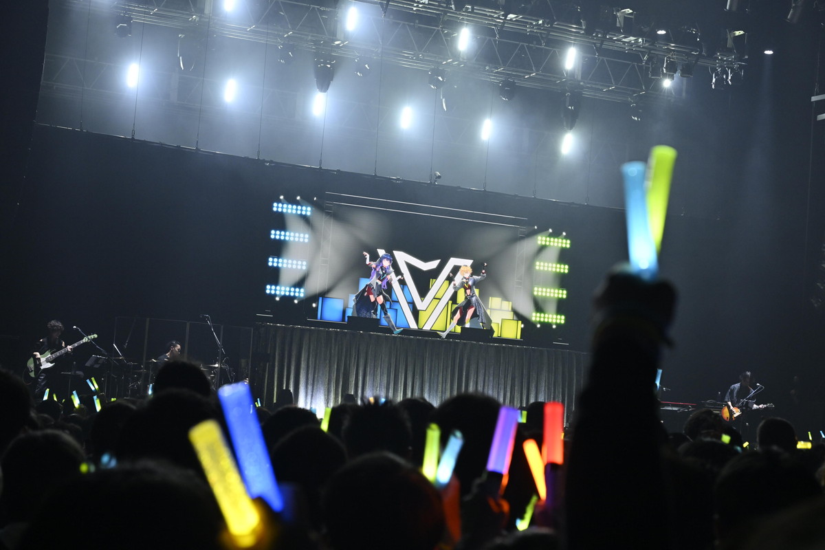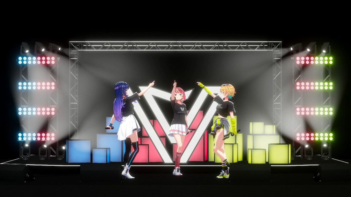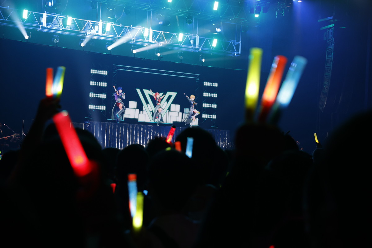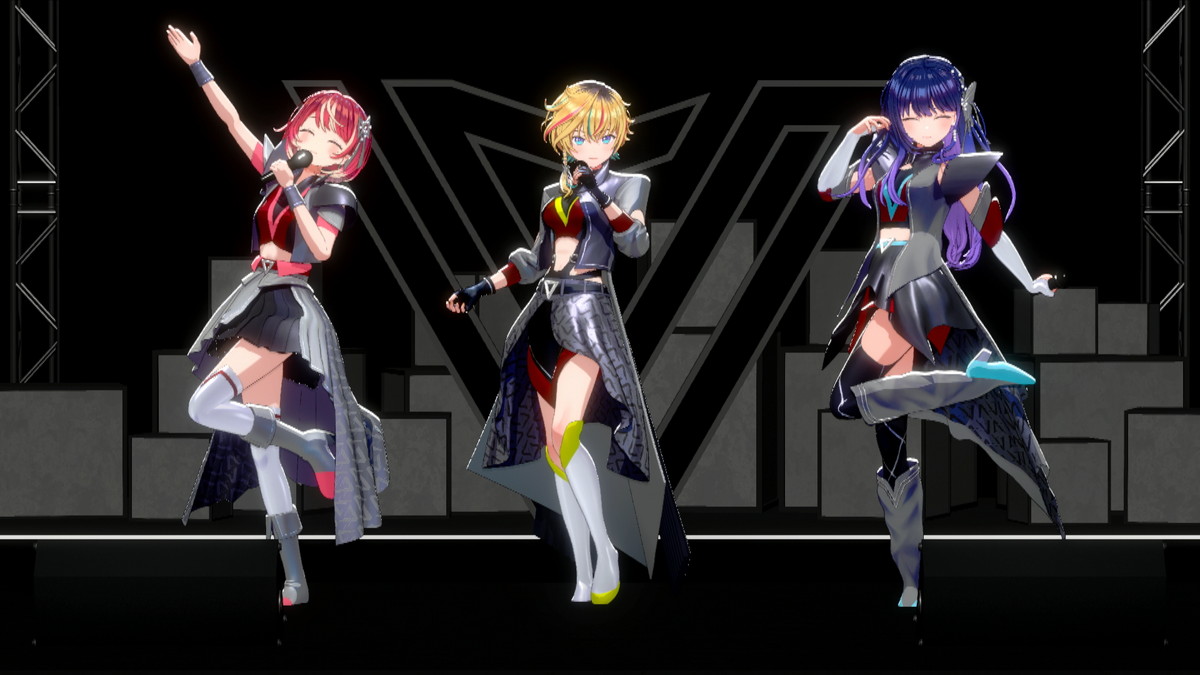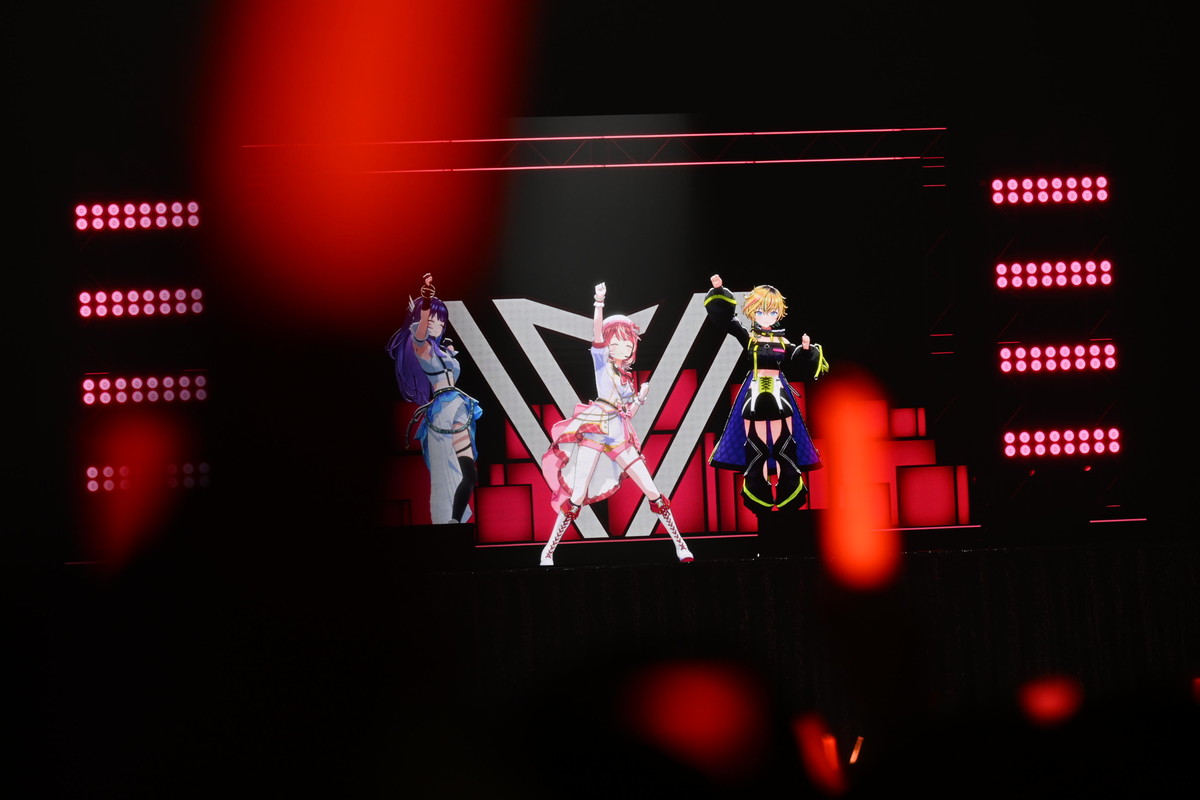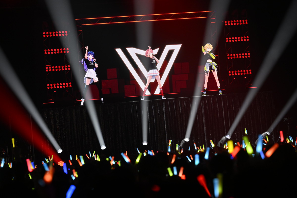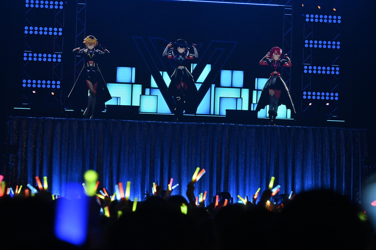 そしてついに、3名がステージ下からせり上がりで登場した。「ヴっとばして ヴっちぎって」と3名が歌うのは、この日に配信が開始された「ヴヴヴ」だ。彼女たちの挨拶や口癖、配信活動での振る舞いなどとともに決意表明も歌詞に織り込んだ、自己紹介ソングの趣のある曲だ。