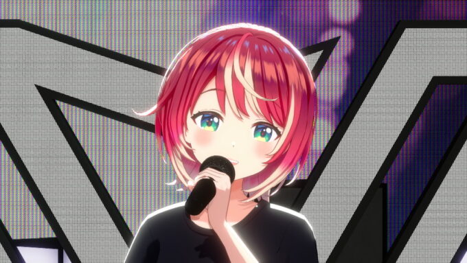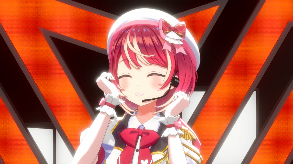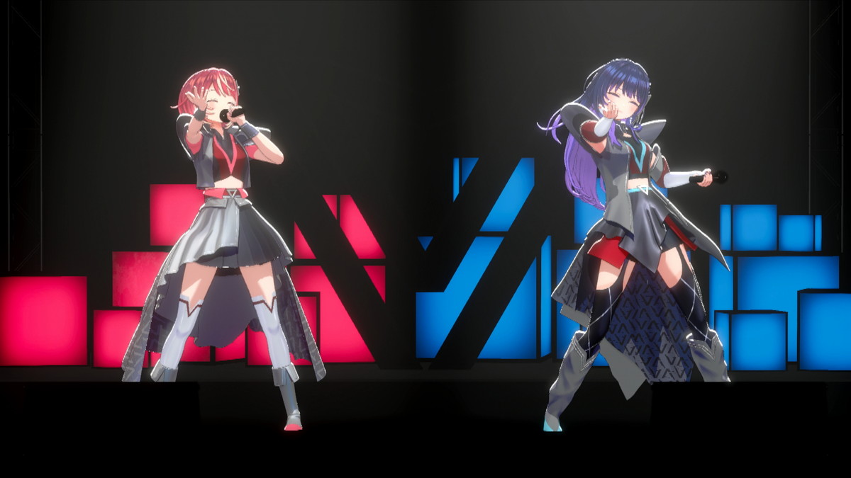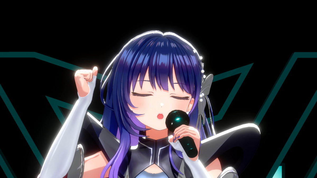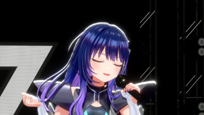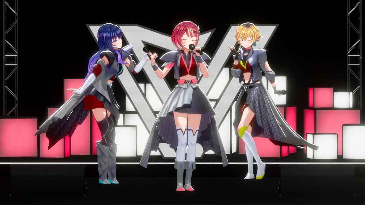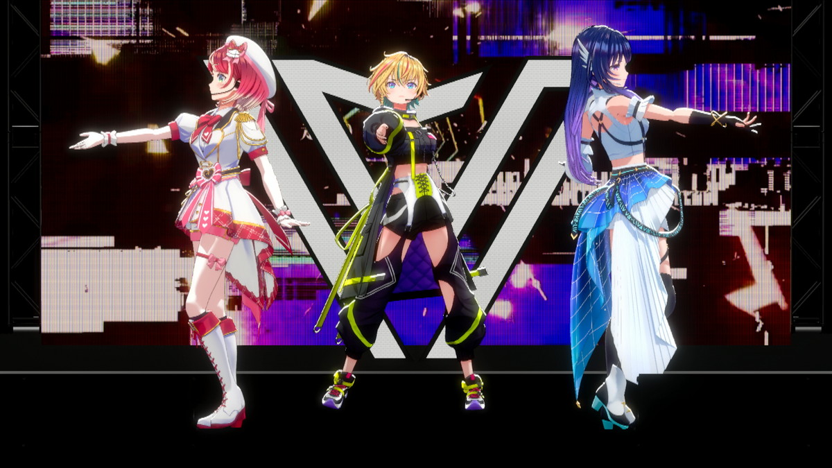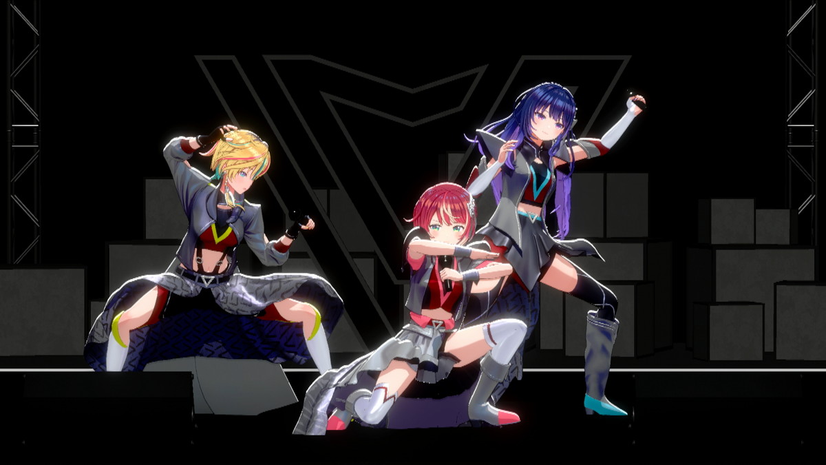 そしてついに、3名がステージ下からせり上がりで登場した。「ヴっとばして ヴっちぎって」と3名が歌うのは、この日に配信が開始された「ヴヴヴ」だ。彼女たちの挨拶や口癖、配信活動での振る舞いなどとともに決意表明も歌詞に織り込んだ、自己紹介ソングの趣のある曲だ。