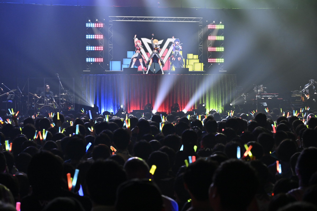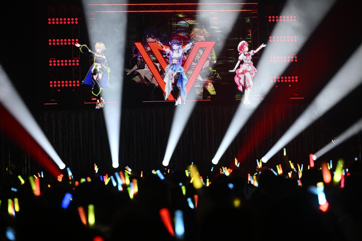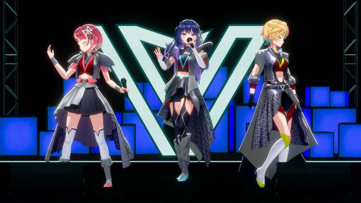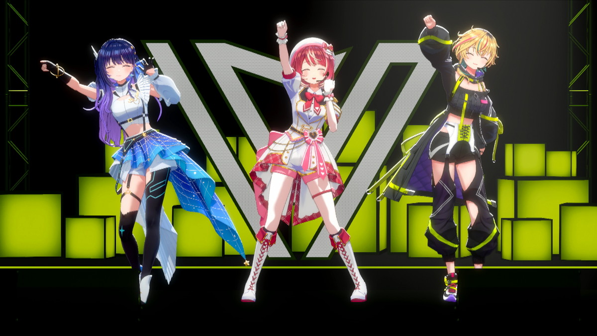 出演したのは、876(バンナム)プロダクション所属の新人ライバーアイドル、灯里愛夏(ともり まなか)さん、上水流宇宙(かみずる こすも)さん、レトラ(サラ レトラ オリヴェイラ ウタガワ)さんの3名。さらに本ライブではヴイアラバンドによる生演奏で3名のパフォーマンスやトークを盛り上げていた。
