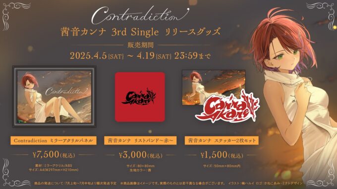 ななしいんくに所属する茜音カンナが3枚目のシングル「Contradiction」を4月6日にリリースした。
