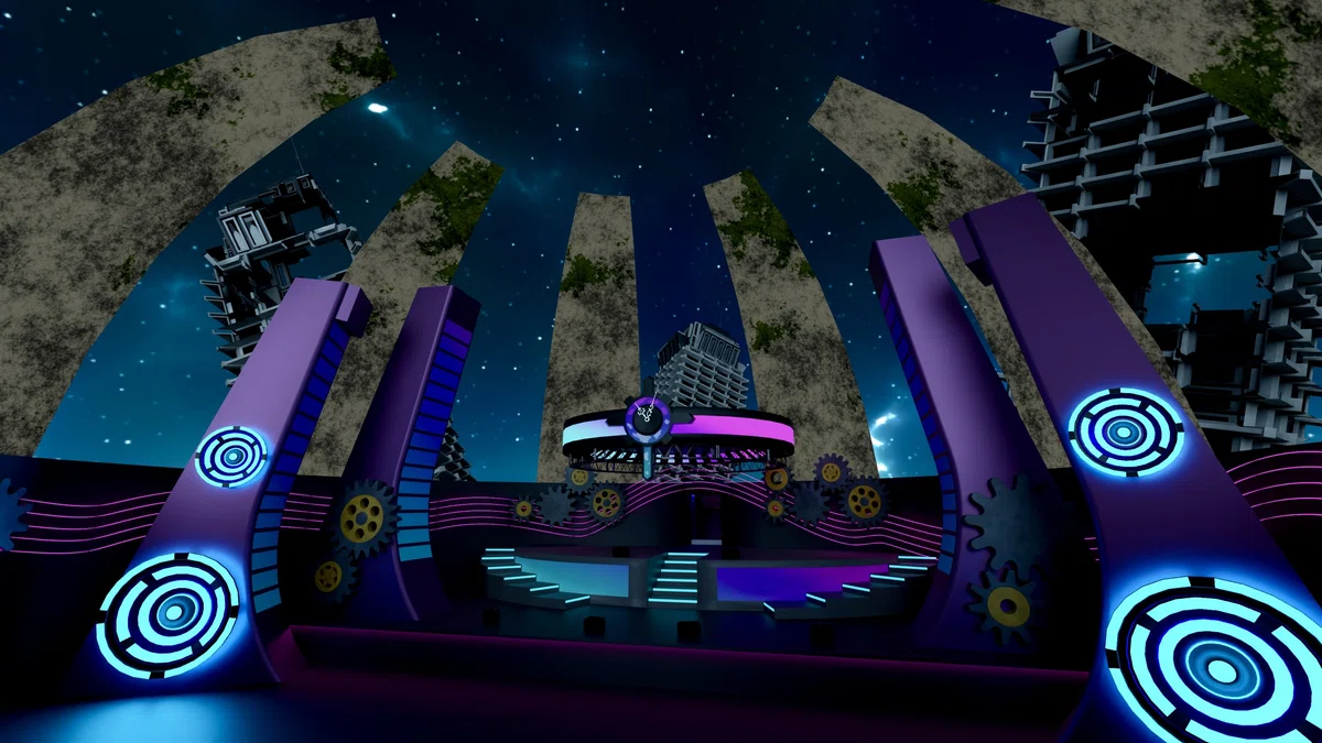 また、「MetaVoyage Live Project vol.3 with MEDA」を開催するにあたり、新たなメタバースワールド「NEO ACOLOGY POLARIS 」が作成された。近未来感あふれる本ワールドは、荒廃した世界にそびえる居住施設「NEO ACOLOGY」を舞台に、暗く淀んだ世界を音楽の力で明るく照らす、“北極星(POLARIS)”のような希望に満ちた空間をイメージして作られたとのこと。