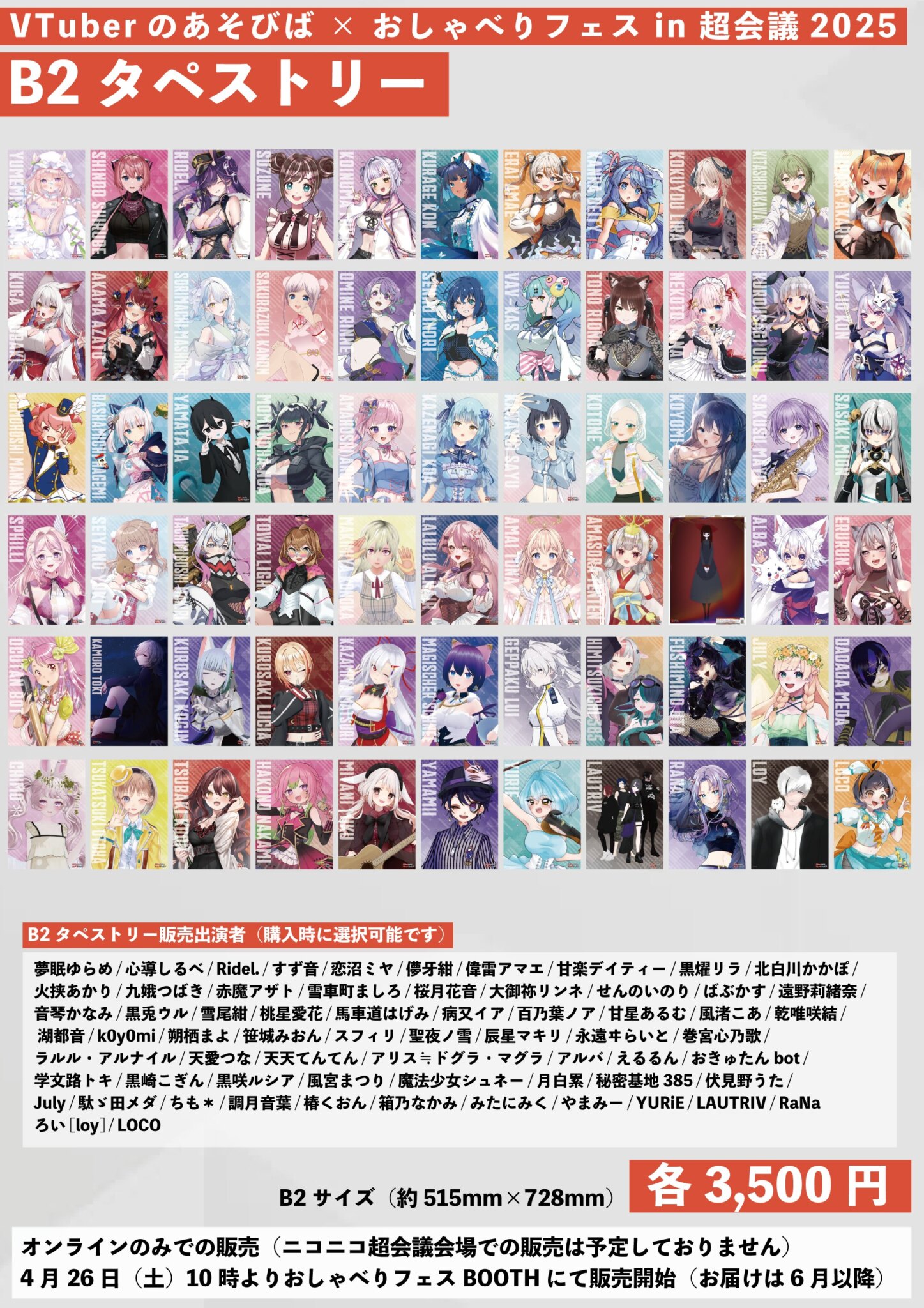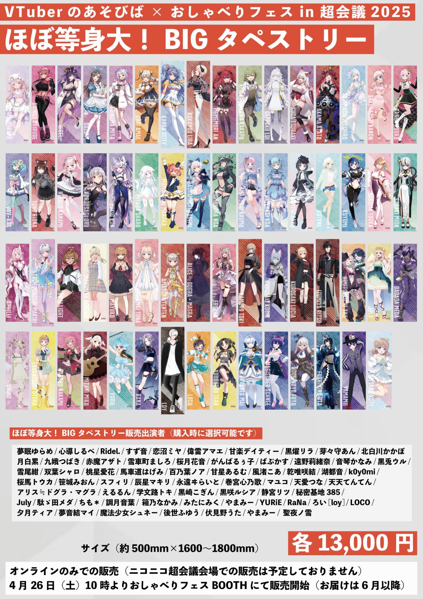 さらにおしゃべりフェスのBOOTHにて、「B2タペストリー」と「ほぼ等身大!BIGタペストリー」も販売いたします。祭りの思い出として、ぜひともお買い上げください!