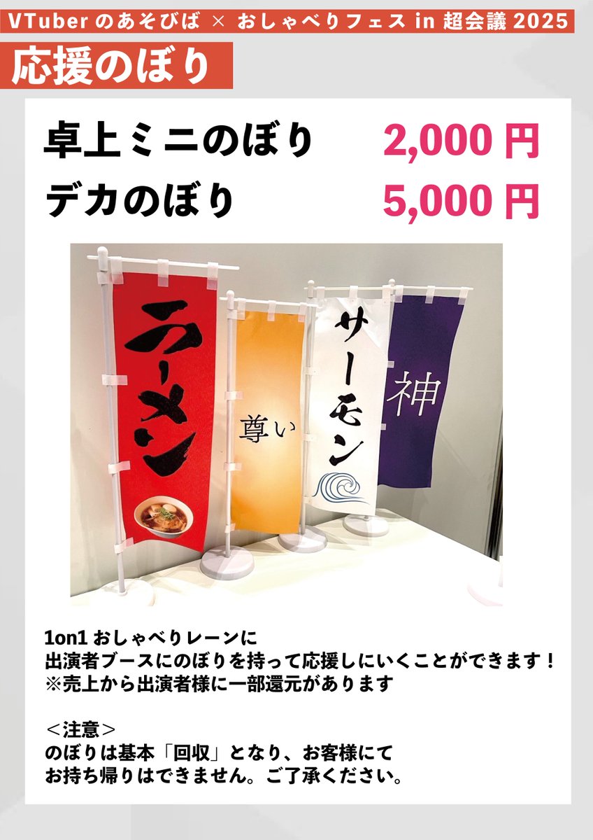 待ち時間は「推し」が同じファン同士で交流したり、ギフトの「のぼり」を持って行って「推し」のブースを華やかにしてみんなで盛り上がるなど、単にお話しだけにとどまらない魅力が詰まっております。事前のチケット購入だけでなく、一部は当日券もご用意できますので、物販までお気軽にお尋ねください。