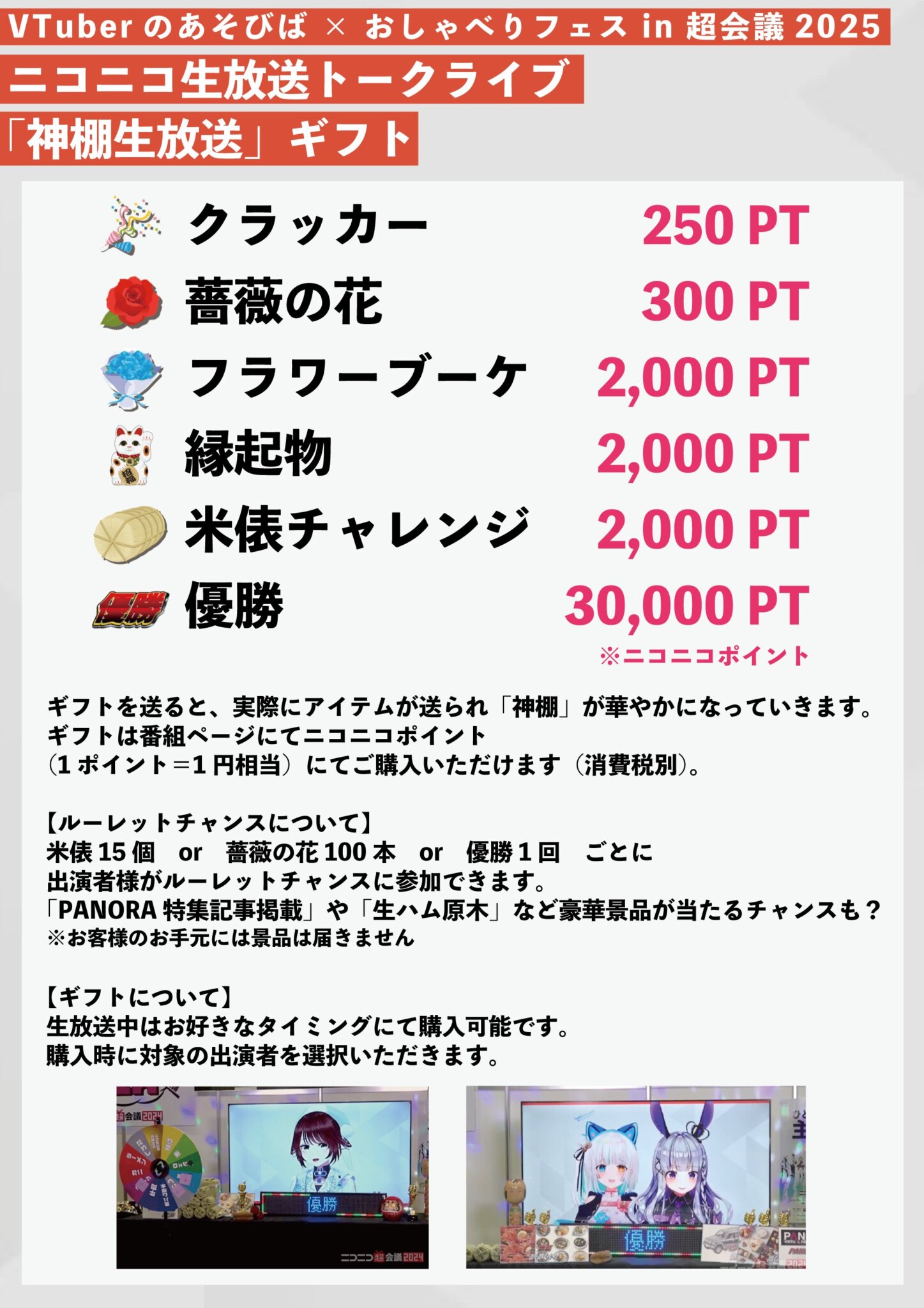 この生放送の特徴が「リアルギフト」。通常、ニコニコのギフトを贈ると画面上に演出が現れますが、おしゃべりフェスでは物理でタレントの周囲に出現します。例えば、バラの花なら贈った分だけのバラが束になって登場し、「推し」への愛を表現したり、超会議への出演を祝ったりすることができます。