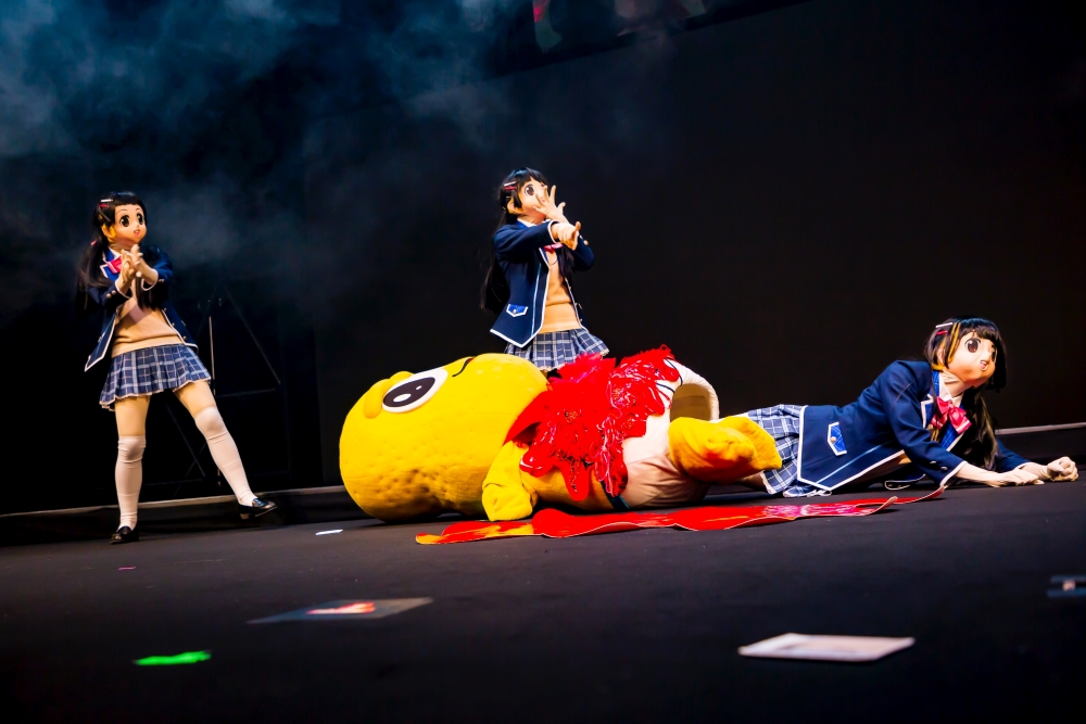 3人でのMCが始まると、咳が止まらなくなったピーナッツくんは、みとちゃんとぽんぽこさんが心配そうに見送る中、一旦、舞台袖に退場。ステージに残った二人がゆるいトークを続けていると、ピーナッツくんのうなり声と共に会場が暗転。明かりが回復すると、ステージの上には、血まみれのピーナッツくんが倒れ、無惨に開いたお腹の穴からは、3人目の謎ノ美兎が現れていた。