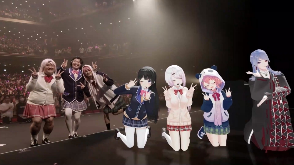 第二のサプライズに、またも大きな歓声が起こる。バーチャルYouTuberのライブに来た観客が、女子校生のコスプレをしたおっさん3人の登場に大歓喜しているのは、おかしな状況な気もするが、これぞ月ノ美兎ワールドと納得もしてしまう。