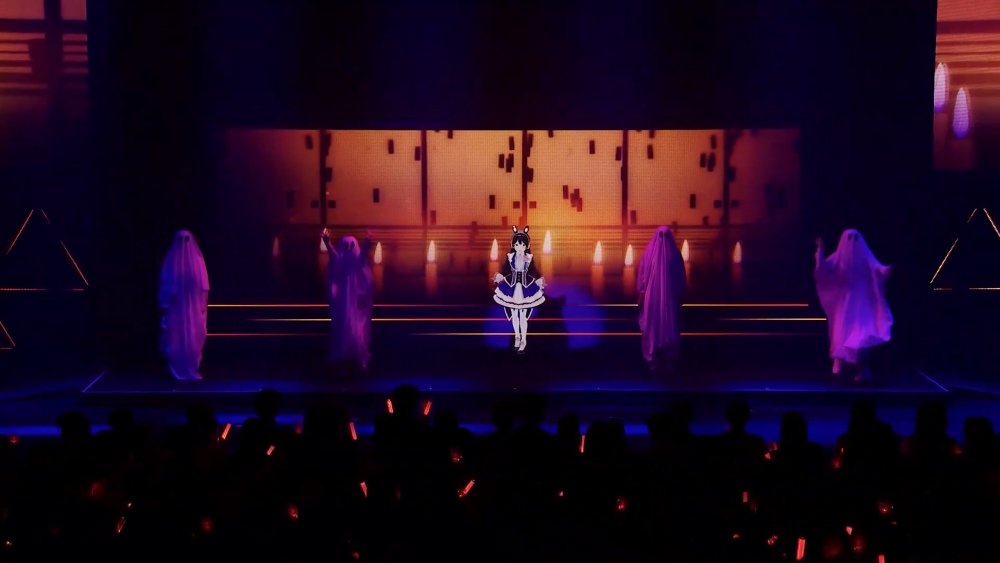 少し不穏な言葉を残して樋口さんと静さんが退場した後の11曲目は、怖い話にまつわる曲と紹介する月ノさん。白い布を被った4人の幽霊ダンサーと共に披露したのは、ミニアルバム収録曲「百cd融怪点」。歌詞やメロディーに沿った歌声のバリエーションの豊富さや、巧みなラップ、そして、終盤のロングトーンには驚かされ、恐怖とは違う感情で背中がゾクッとした。