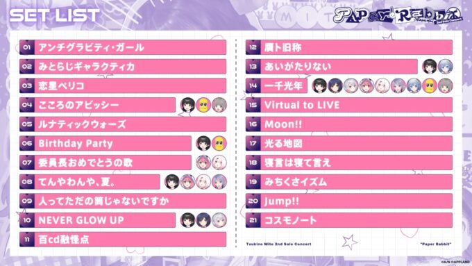 3人でのMCでは、月ノさんが「Paper Rabbit」というライブタイトルの由来も披露。デビュー当時は、紙のようにペラペラなLive2Dの体だった自分たちが、3Dモデルの体で豪華なライブも開催できるようになったことへの感謝も語っていた。