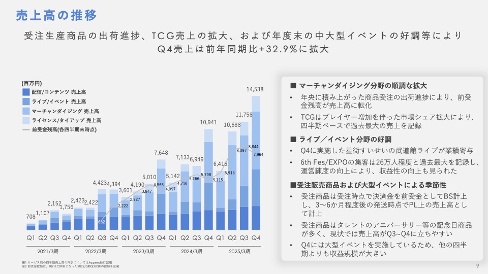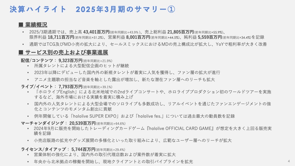 サービス別では以下の割合になっており、売上高に占めるボリューム、成長率ともにマーチャンダイジング(グッズ)が売上の柱になっていることがわかる。決算資料では、2024年9月に発売したトレーディングカードゲーム「hololive OFFICIAL CARD GAME」が想定を超える販売実績を記録したと解説している。