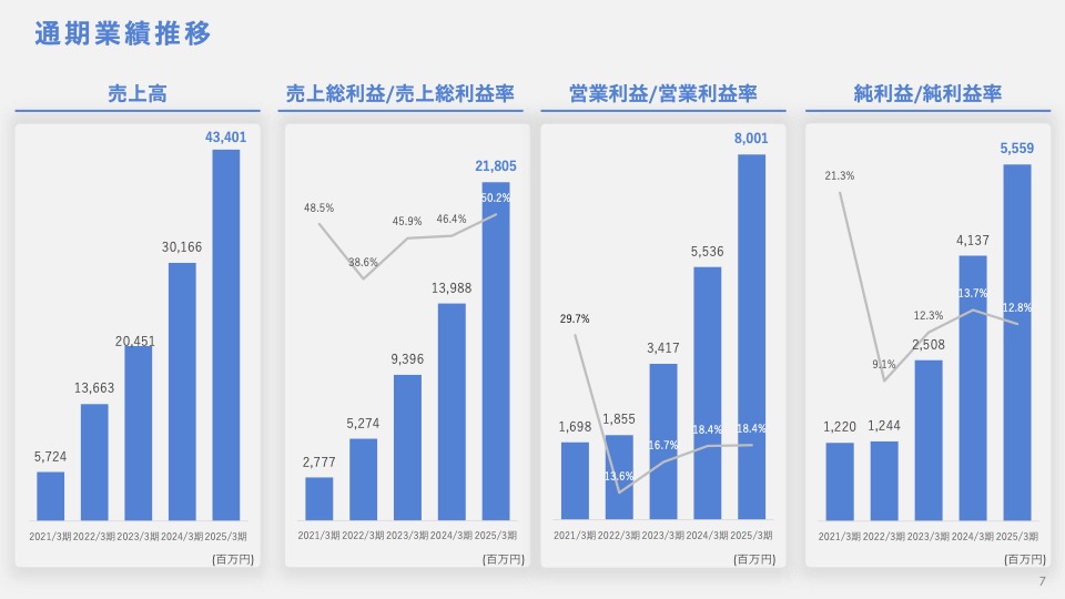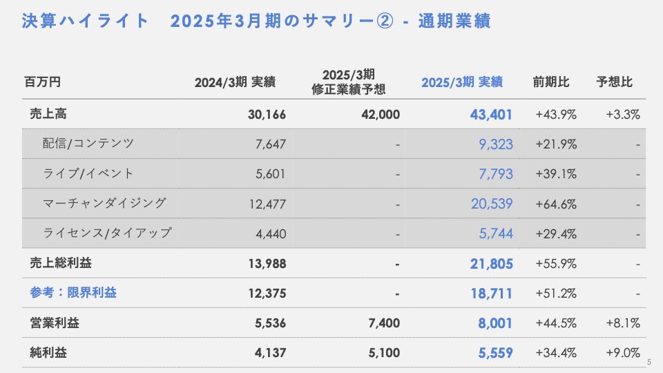 VTuber事務所「ホロライブ プロダクション」を運営するカバーは13日、メディア向けに決算説明会を開催した。2025年3月期の業績について、売上高が434億100万円(前年同期比+43.9%)、売上総利益が218億500万円(同+55.9%)、営業利益が80億100万円(同+44.5%)、純利益が55億5900万円(同+34.4%)と大きな成長を見せたことを明らかにしている(決算説明会資料)。