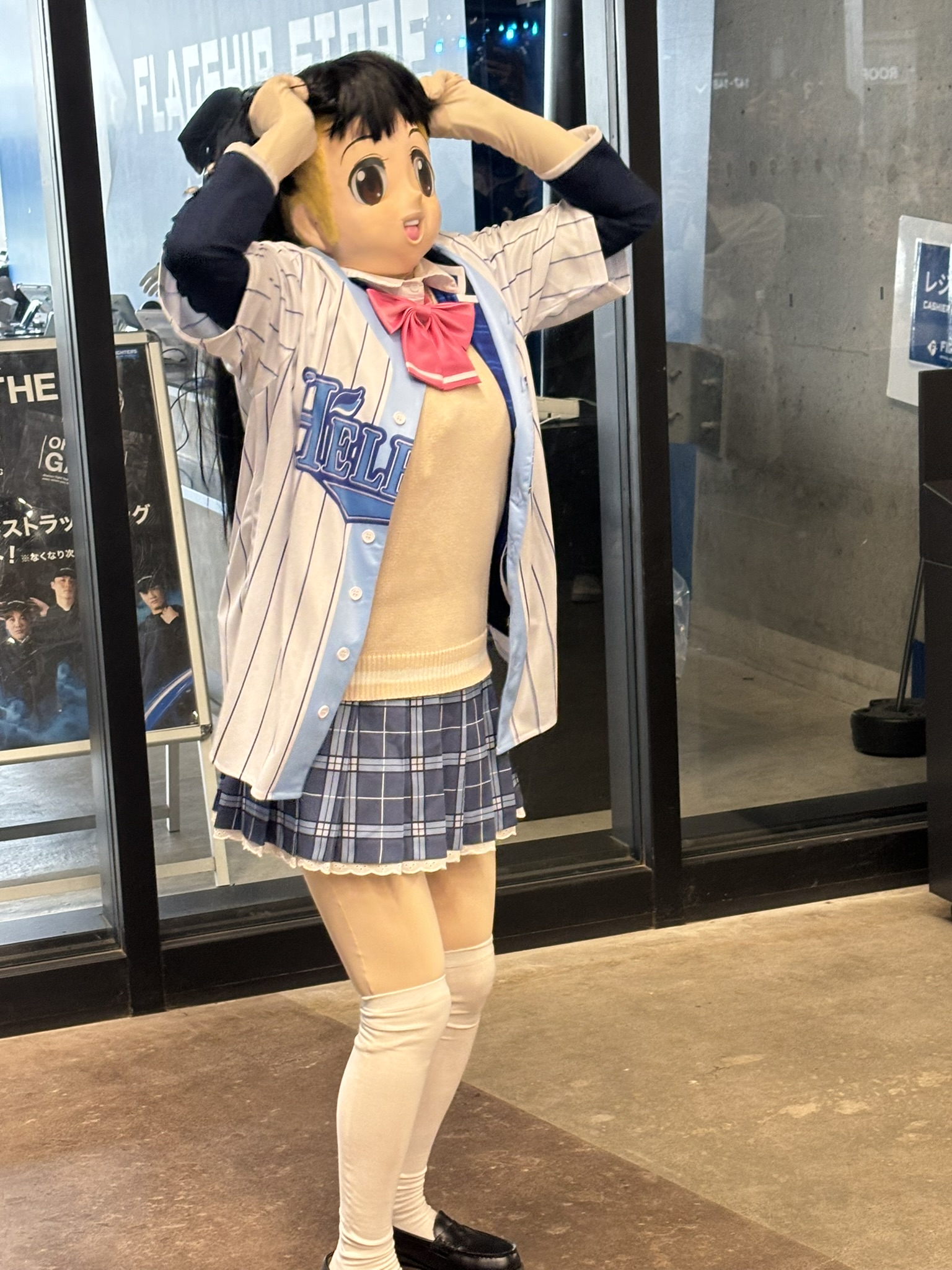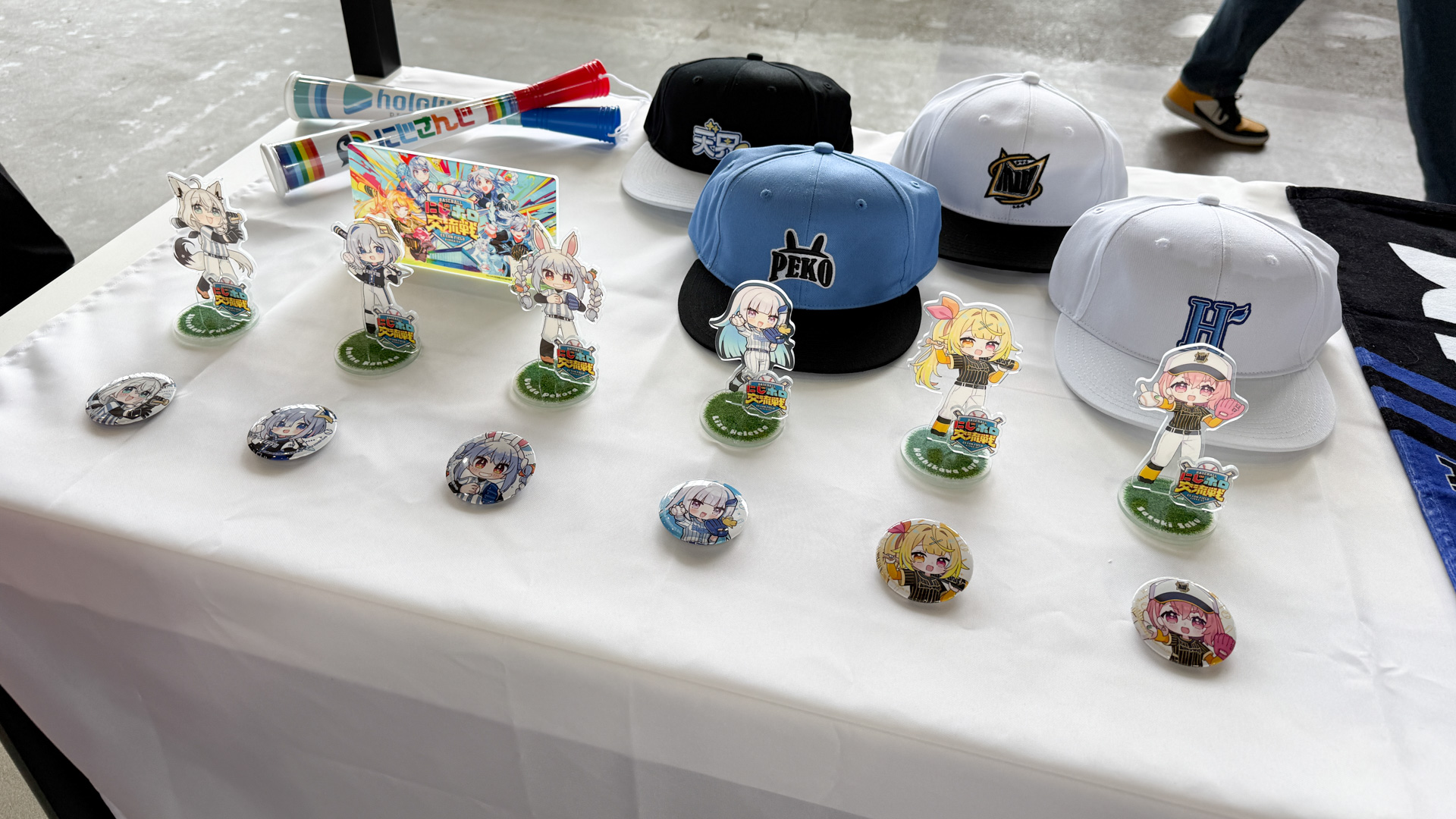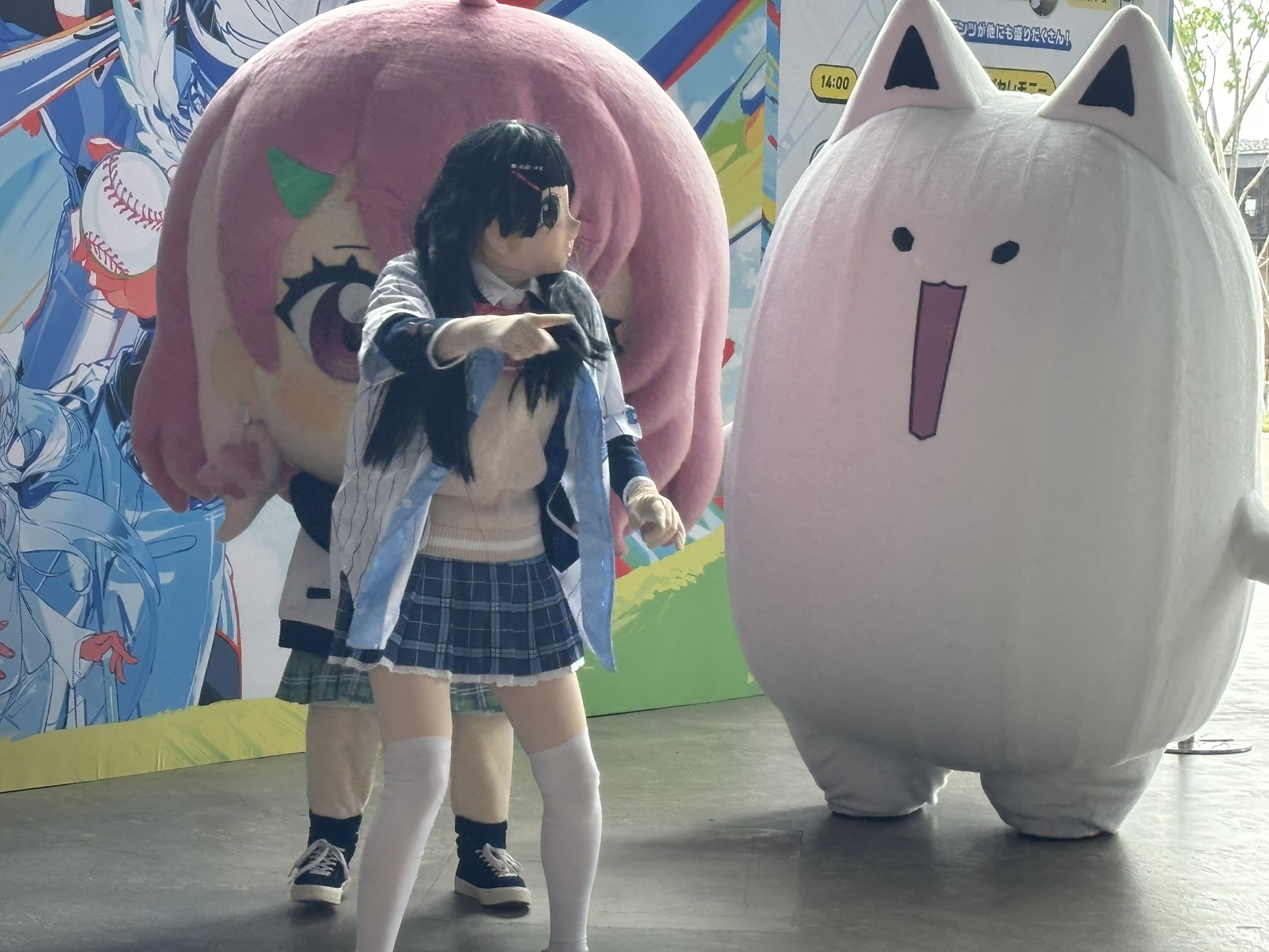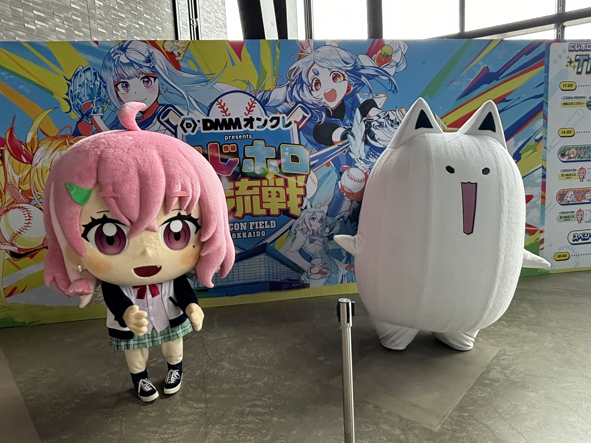 今回のイベントは野球の交流戦にあわせて数多くの催し物やグッズ販売がなされていました。特に目を引いたもののひとつがフブラ(白上フブキのマスコットキャラクター)とサクヤヨー(笹木咲のマスコットキャラクター)の着ぐるみ。サービス精神旺盛であちこちに愛嬌を振りまいていました……がそれ以上に存在感があったのは謎ノ美兎(月ノ美兎の天敵)。