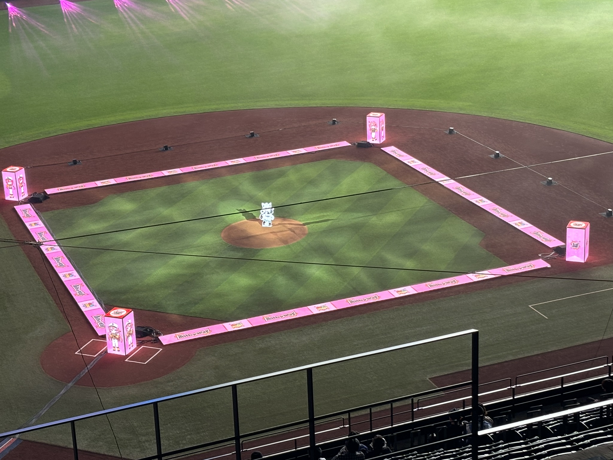 加えてフィールドにはいろいろな仕掛を用意していました。ホーム、1、2、3塁には直方体のデジタルサイネージが立てられており、打者や走者を表示。また塁間もデジタルサイネージが敷かれており、光の演出で盛り上げます。投手はそれぞれのチームのベンチからスタンドポップの姿で持ち出されて、マウンドに立っています。表裏で攻守が変わったり、ピッチャーが交代すると、スタッフがスタンドポップを持ち運んで置き換えるという力技で運用していました。