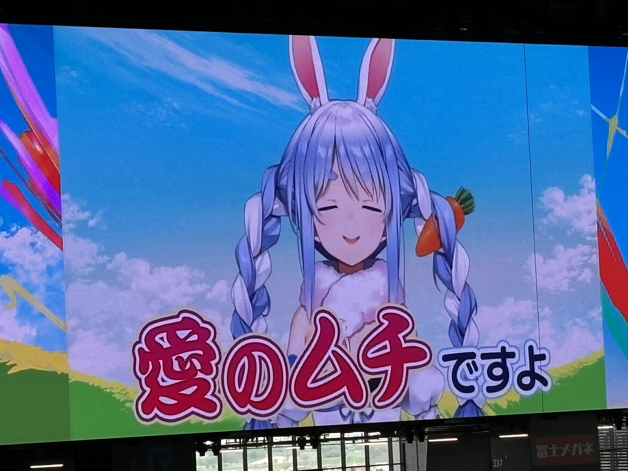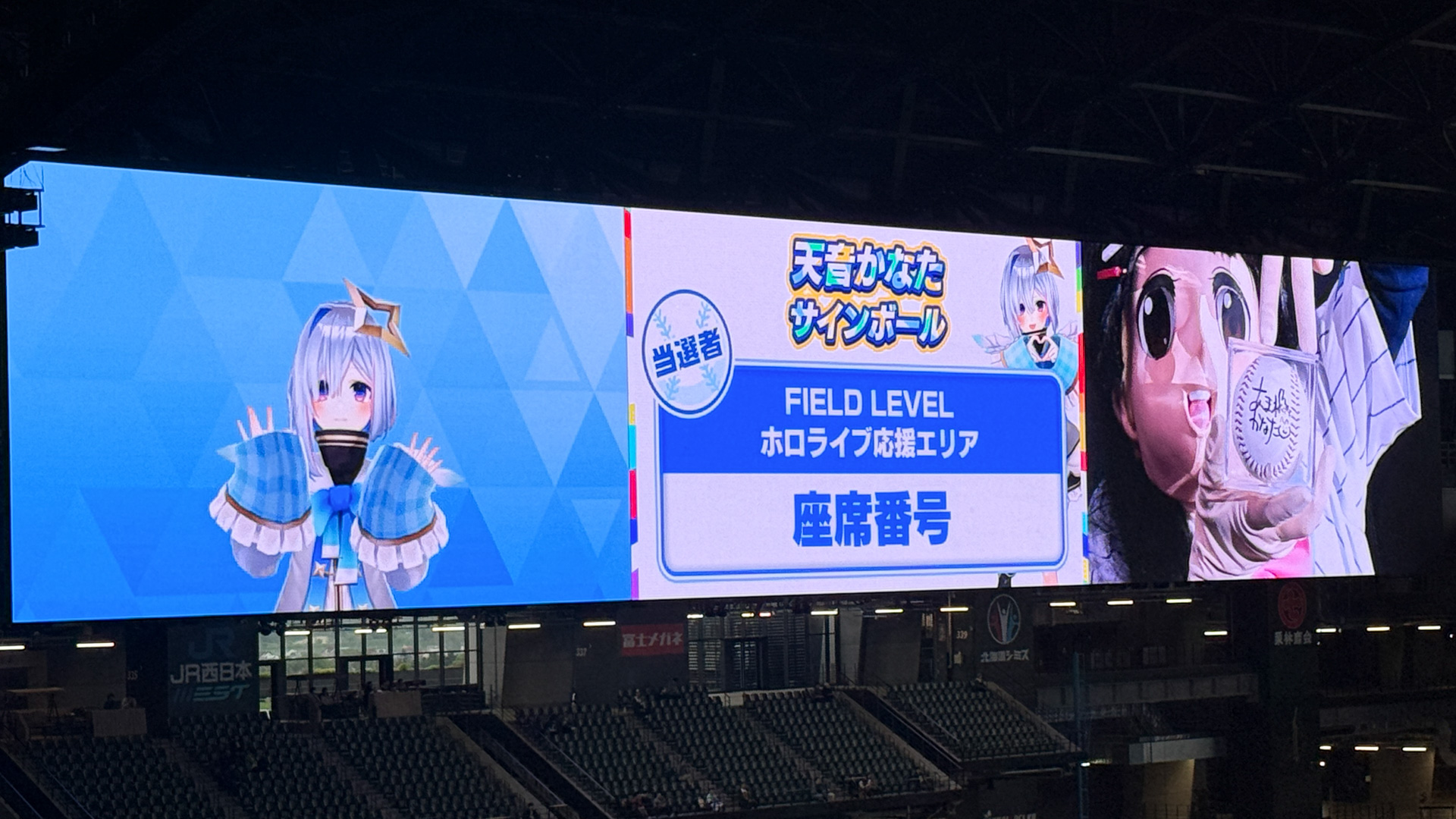 VTuberは配信で視聴者と近い距離で会話できるのが強みのひとつ。今回はさすがに球場が大きいため無理かと思いきや、サイン入りボールをプレゼントするための抽選で当たった人にカメラが近づき、その人に話しかけるというサプライズがありました。