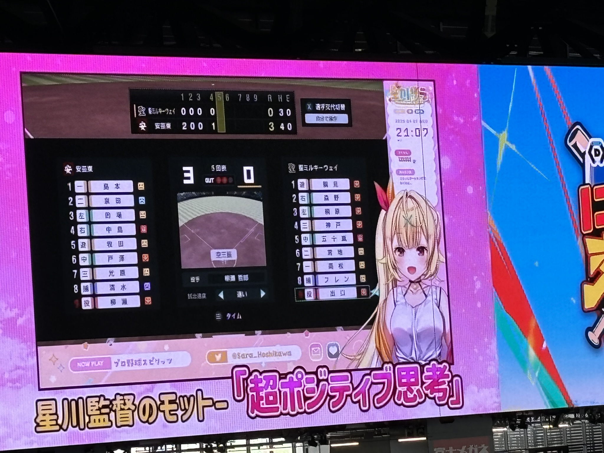 試合が始まり、ゲーム内の打者が打つと、ファンからは声援があがるようになります。このVTuberがイメージの中で具現化する瞬間をみんなと共有できるのが、本イベント最大の魅力です。
