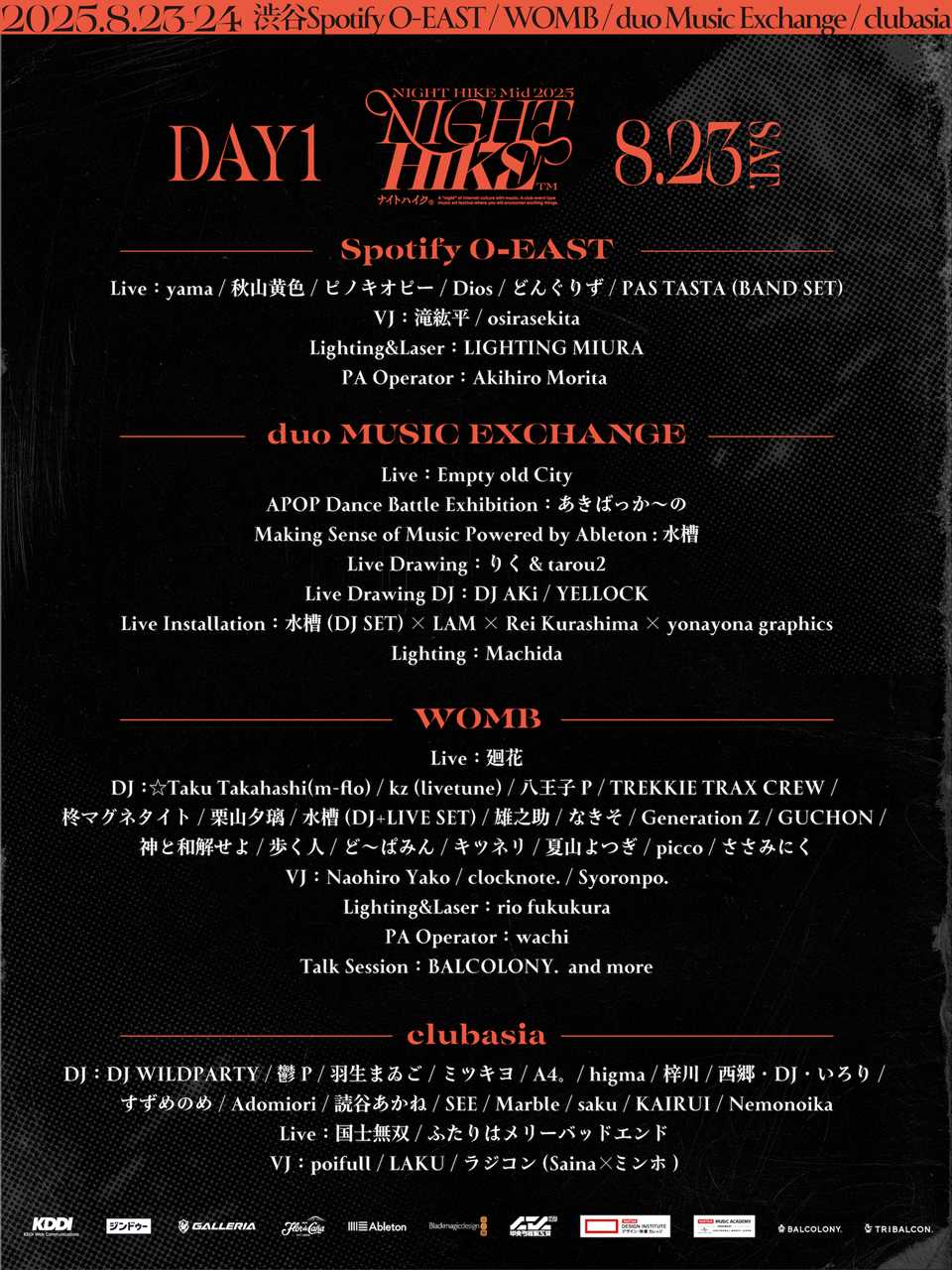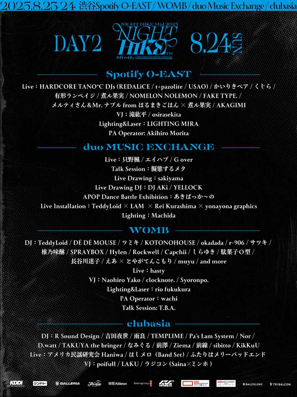 2025年8月23日(土)・24日(日)、Spotify O-EAST、WOMB、duo MUSIC EXCHANGE、clubasiaの4会場を舞台に、2日間にわたって開催される回遊型ミュージック&アートフェス『NIGHT HIKE Mid 2025 supported by ジンドゥー』が、ラインナップ第3弾 & 出演会場別ラインナップ公開。