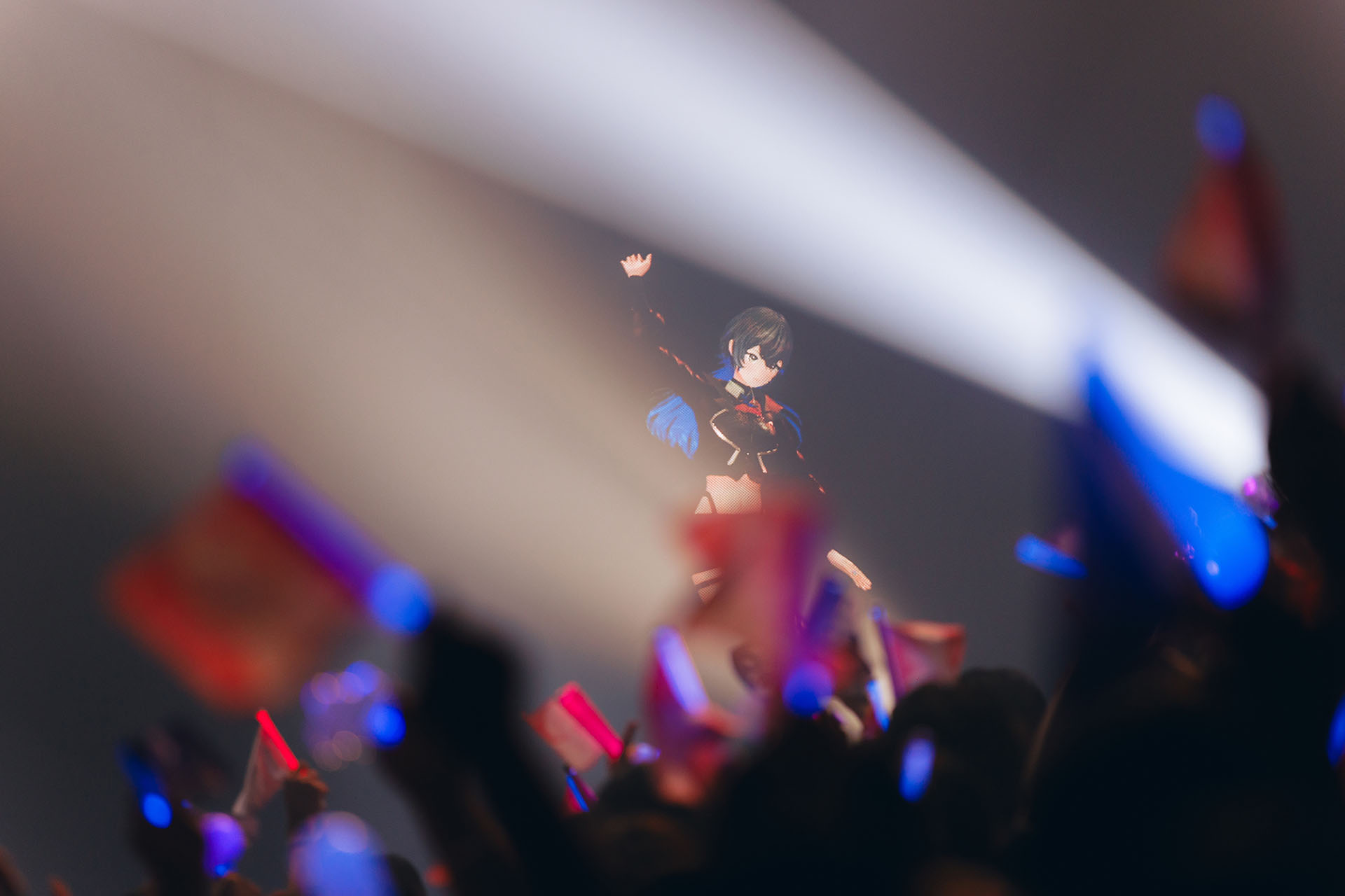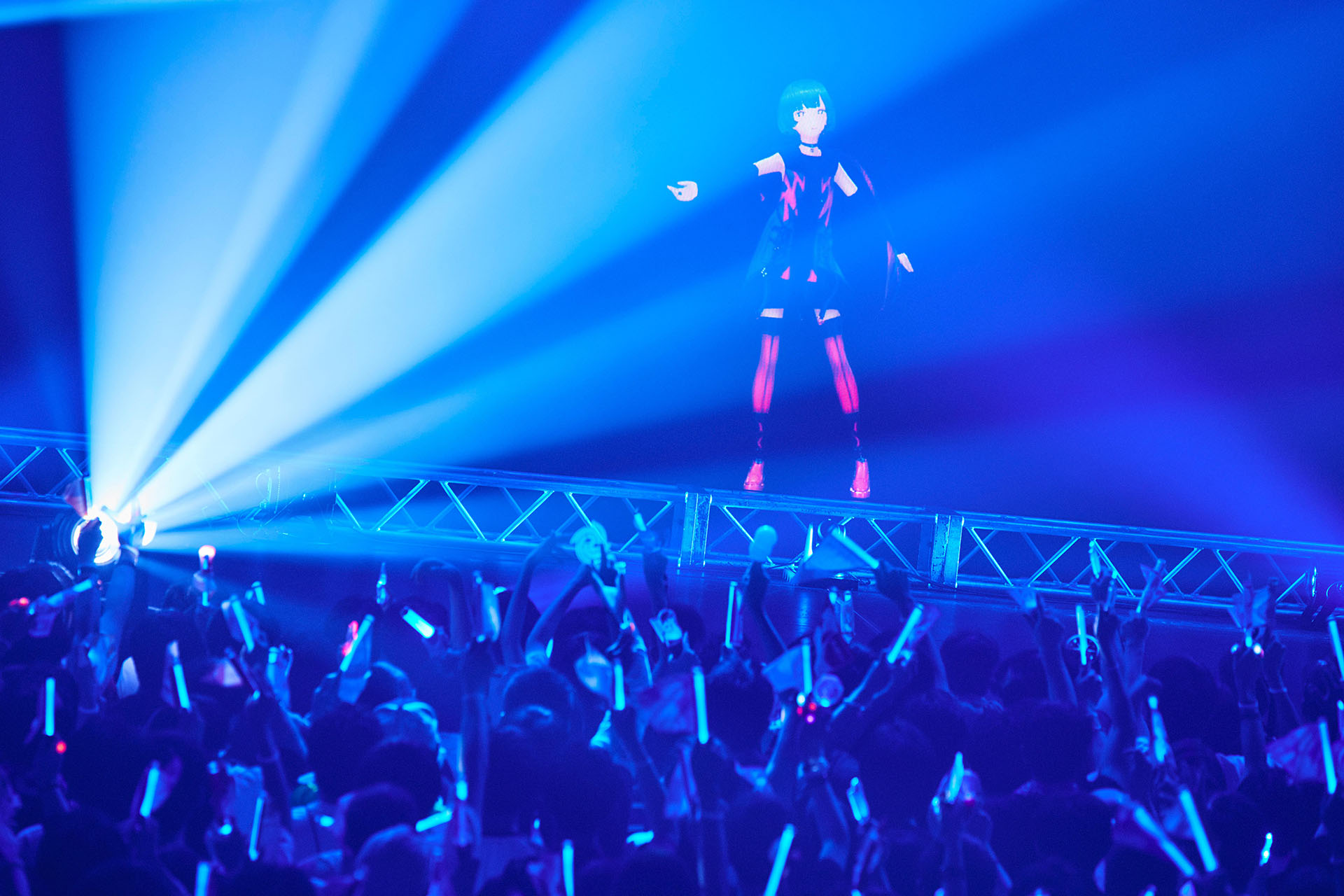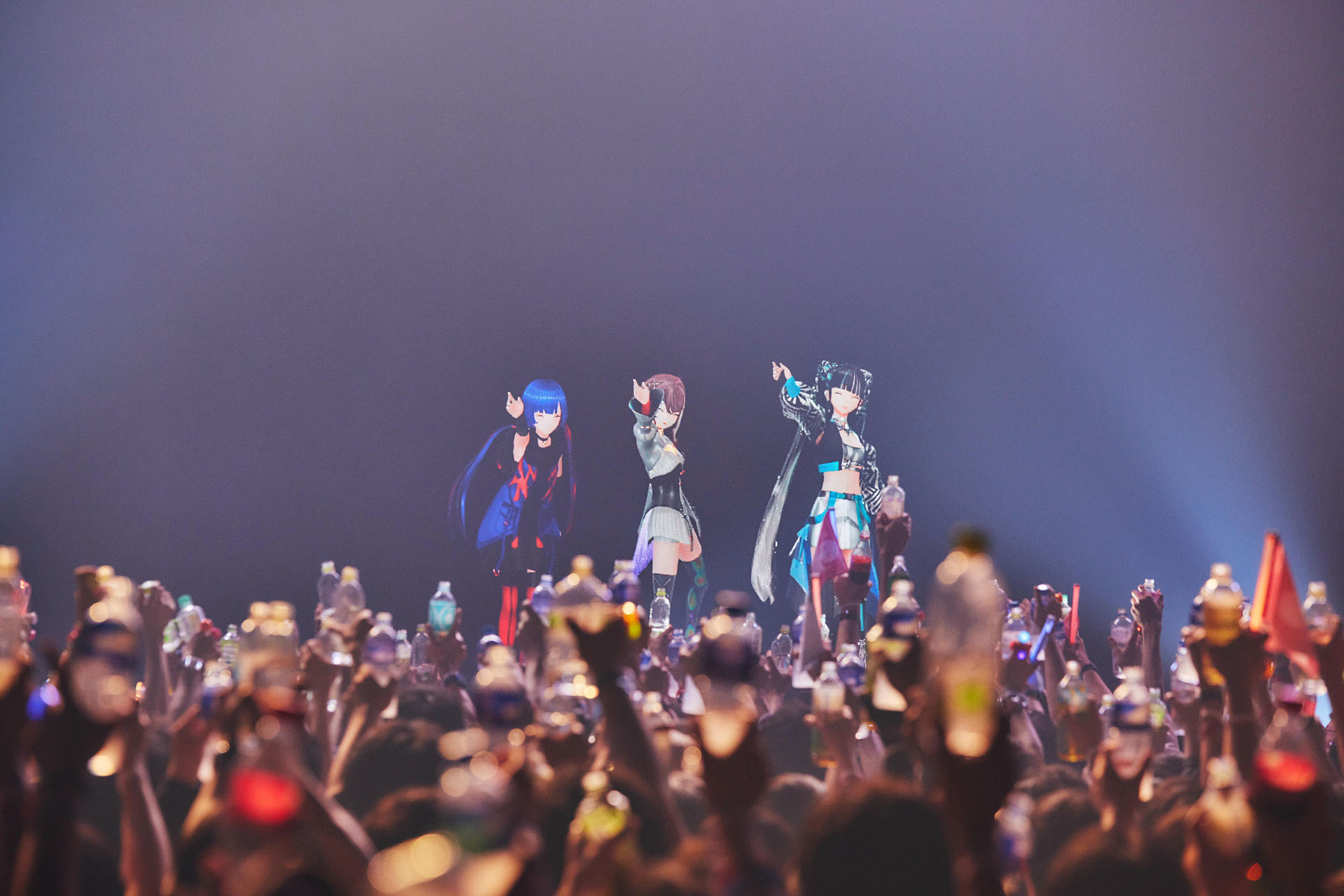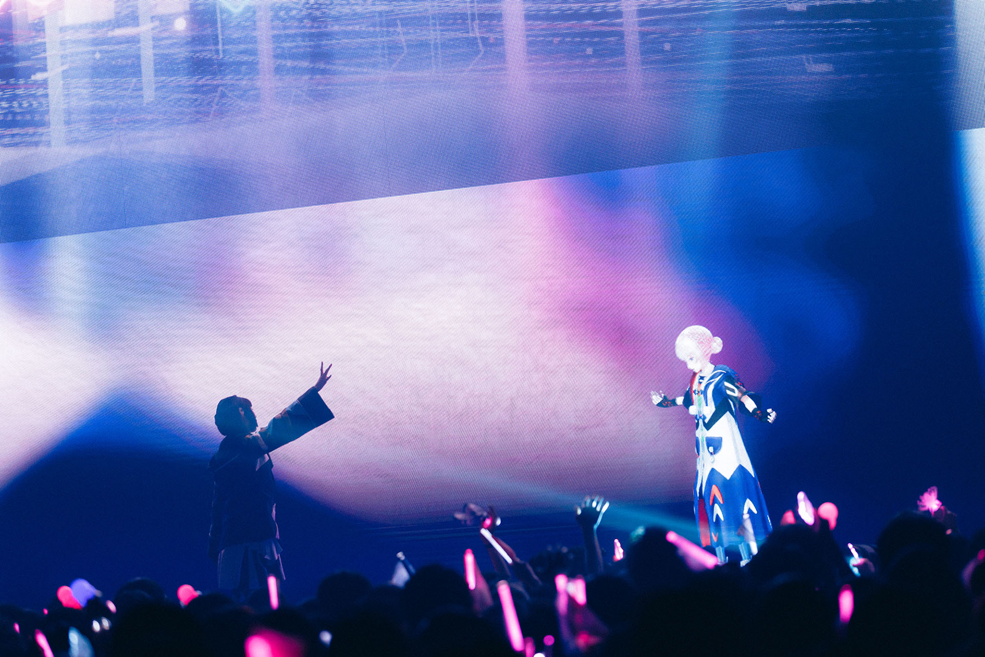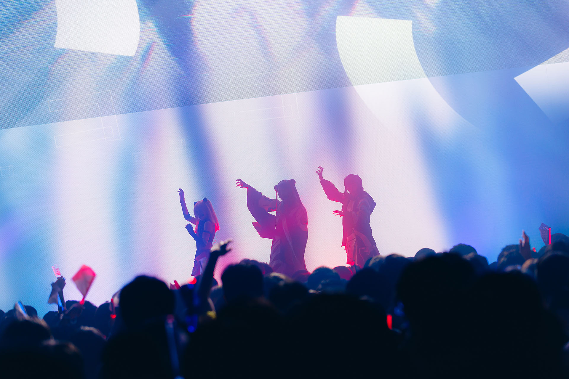 最初に登場したのは、オープニングアクトの心世紀で、「フェイクナイト・シンデレラ」「Ephemeral」の2曲をパフォーマンスした。初めて彼女ら心世紀を見た人は驚いただろうが、暗転したステージの下で生身の姿で歌い踊っていくのが特徴的だ。