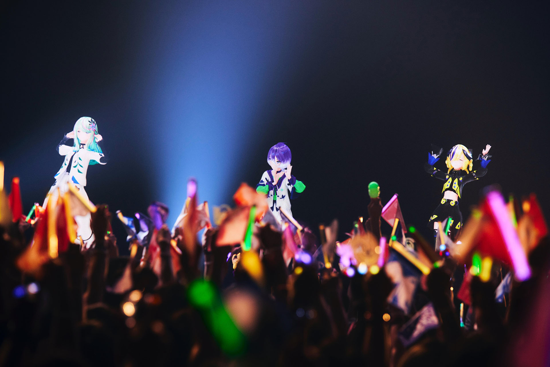 オルゴールが奏でられるなかで1人センターポジションに登場した幸祜が、「愛 mistake? 偏愛 不可知の世界」とゆったりと歌い始めると、花譜とヰ世界情緒の2人がその後ろからすぅっと登場し、ヰ世界情緒の楽曲「パンドラコール」をトリオで歌唱していった。