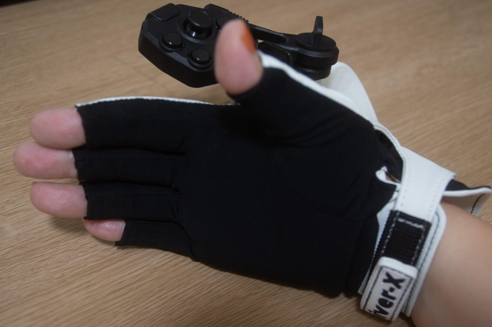 グローブを手に装着。これはすでに「ContactGlove2」に「Magnetra2」を付けた状態で、ヒンジによってコントローラー部分(Magnetra2)を手元か、手の甲に移動できるのが大きな特徴だ。グローブ内部のセンサーが傷つきやすいので、取り外しの際は注意が必要とのこと。
