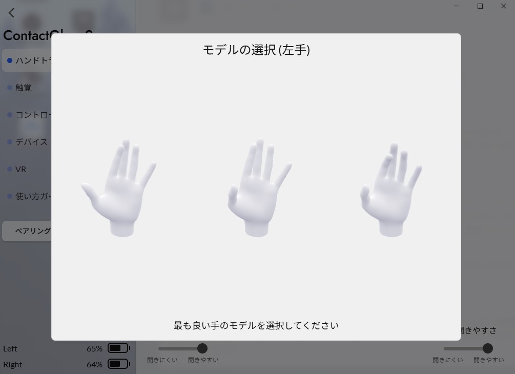 画面に従って手の形を動かしていくと、最終的に3種類の手のモデルが表示され、自分の手の動きと最も近いモデルを選択することでキャリブレーションが行われる。簡単に進む一方、筆者の手のサイズや形の問題かもしれないが、なかなか正しい手の動きを取得できずに何度かやり直している。対策としては、キャリブレーションの前に指の曲げ伸ばしを行うと良いとのこと。起動するたびにキャリブレーションしていたが、毎回何度かやり直したので、もしかしたら手の形状との相性はあるのかもしれない。