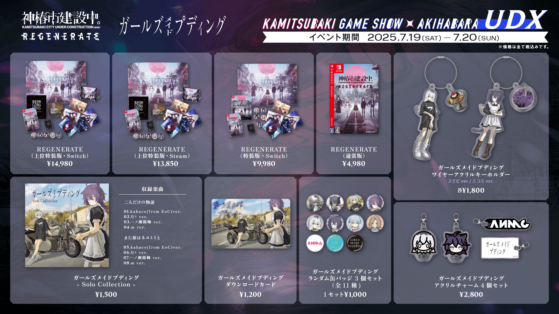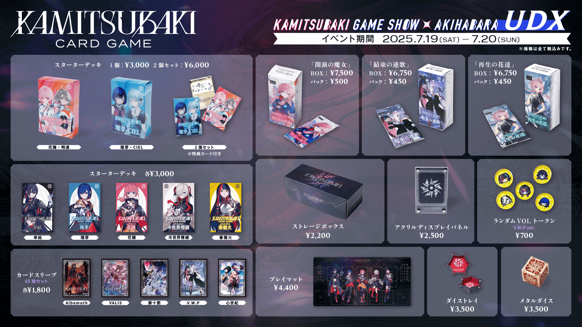 本イベントではKAMITSUBAKI STUDIO所属アーティストをモチーフにしたTCG「KAMITSUBAKI CARD GAME」やADV「神椿市建設中。REGENERATE」、VR ADV「神椿市建設中。VIRTUAL REALITY」、リズムゲーム「神椿市協奏中。」、ADV「神椿學園新聞部」、ADV「ムーンレスムーン」、ADV「ガールズメイドプディング」の試遊が可能。さらに、神椿TCGの公式大会「KAMITSUBAKI CHAMPIONSHIP」も開催予定となっている。