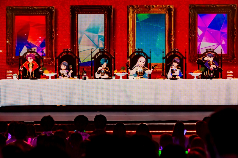 曲の終わりとともに暗転したステージが明るくなると、ワインのボトルやフルーツ、スイーツなどが大量に置かれた長テーブルの前に6人が並んで座っている。ボカロ曲「main dish が足りてない」のMVの映像が再現されているのだ。お洒落なメロディーの中にワイルドなラップも混じり、少し行儀の良いギャングのファミリーのような雰囲気。曲の途中からは、立ち上がってテーブルの前に腰をかけたりしながら歌い踊る6人。1曲目では、長尾さん、渡会さんが高音も奇麗なことに少し驚き、2曲目では葉加瀬さん、先斗さん、小清水さんの低音のカッコ良さも印象に残った。以前からにじさんじ有数の歌い手の1人だと思っていて緑仙さんを含めて、この後は、どんな曲とパフォーマンスで驚かせてくれるのか楽しみになる開幕2曲だった。