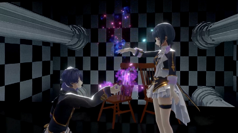 5曲目は、長尾さんと小清水さんが「ロウワー」をカバー。半分背中合わせに置かれている椅子に座った二人は、「プロジェクトセカイカラフルステージfeat.初音ミク」収録の人気曲を歌っていく。アンニュイな雰囲気で始まるが、段々とテンポもテンションも高まり、立ち上がって高らかに声を張り上げる。2番に入ると、長尾さんが手の先からは炎のようなエフェクトを放ちながら、剣舞のように激しく踊り出す。そして、ここまで常に背中合わせだった二人が、向かい合い手を近づけると、小清水さんの手からも青いエフェクトが放たれて、2色の光が混じり合う。物語性を感じさせる演出だった。