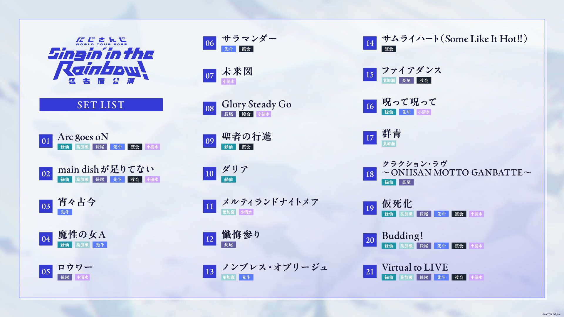 出演メンバーが異なるので当たり前のことではあるのだが、選曲の方向性なども仙台公演からはガラッと雰囲気が変わった名古屋公演。仙台、名古屋とまったく異なる2つライブを観られただけに、7月21日(祝)の横浜公演や、急遽、追加となった7月12日(土)の上海公演がどのようなライブになるのかが、さらに予想できなくなってきた。まだ始まったばかりのにじさんじワールドツアーがますます楽しみになる公演だった。